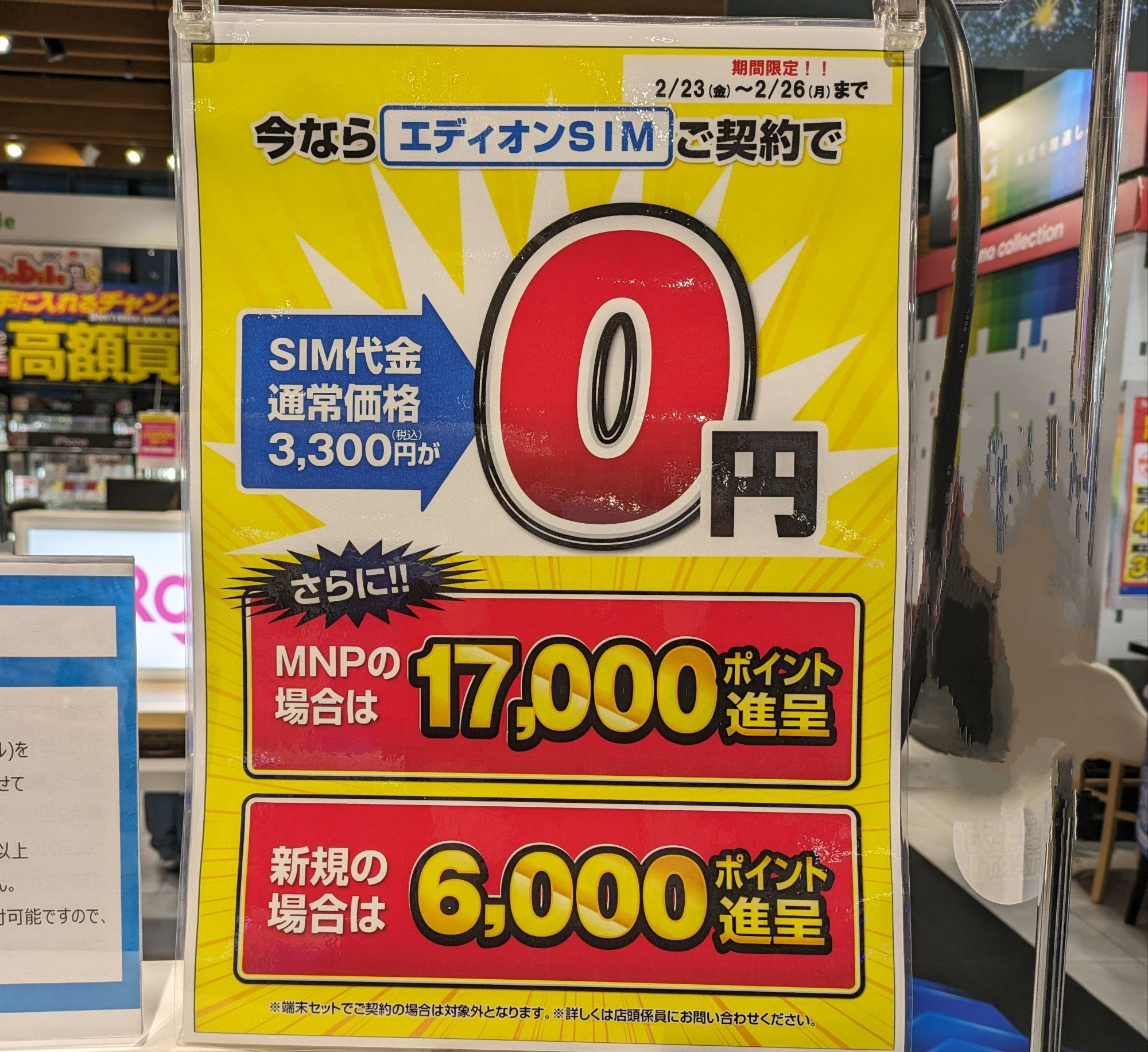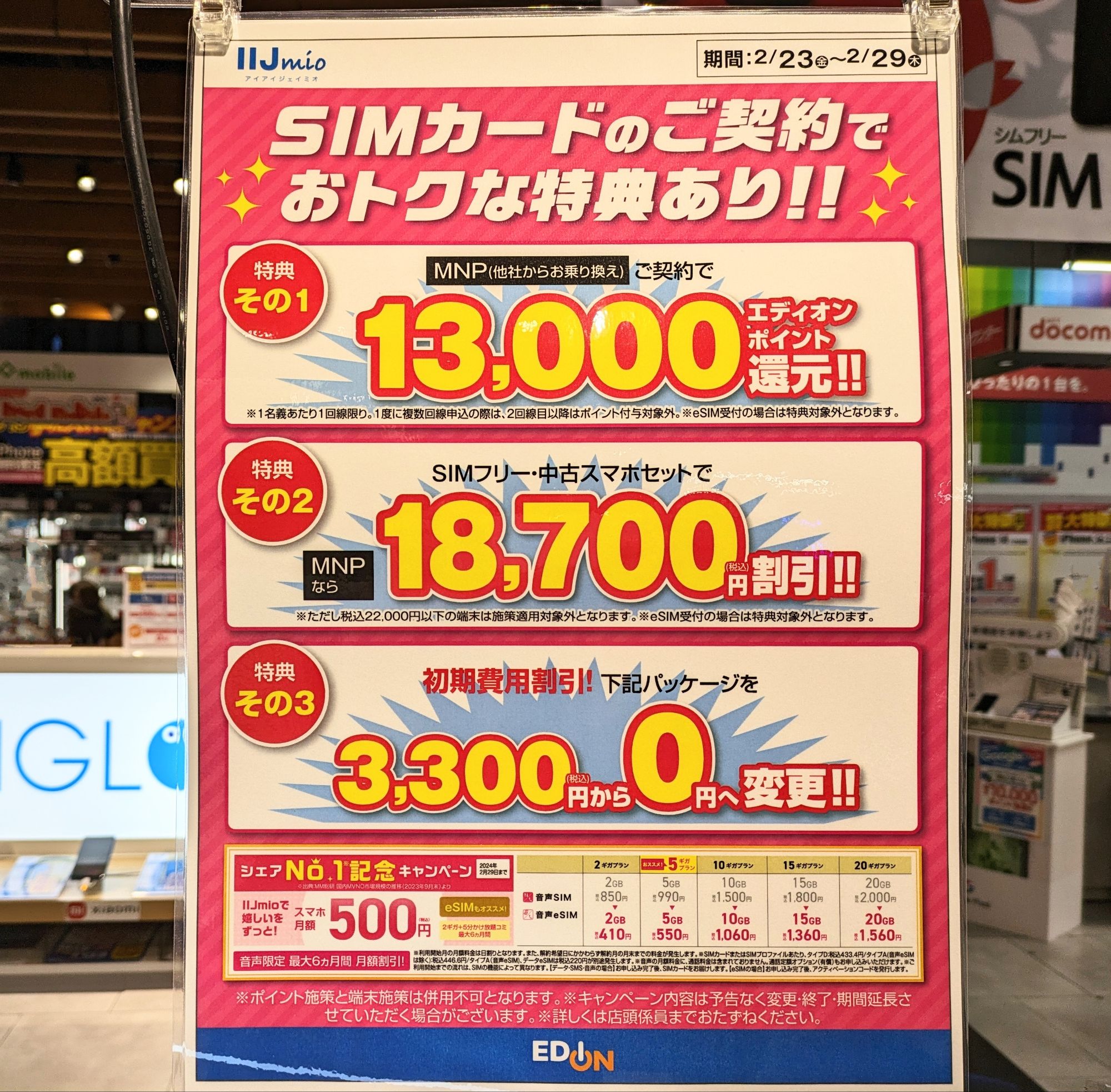 エディオンでは、IIJmioへのSIMのみMNPで13,000ポイント還元となっています。事務手数料は0円。2/29(木)まで。