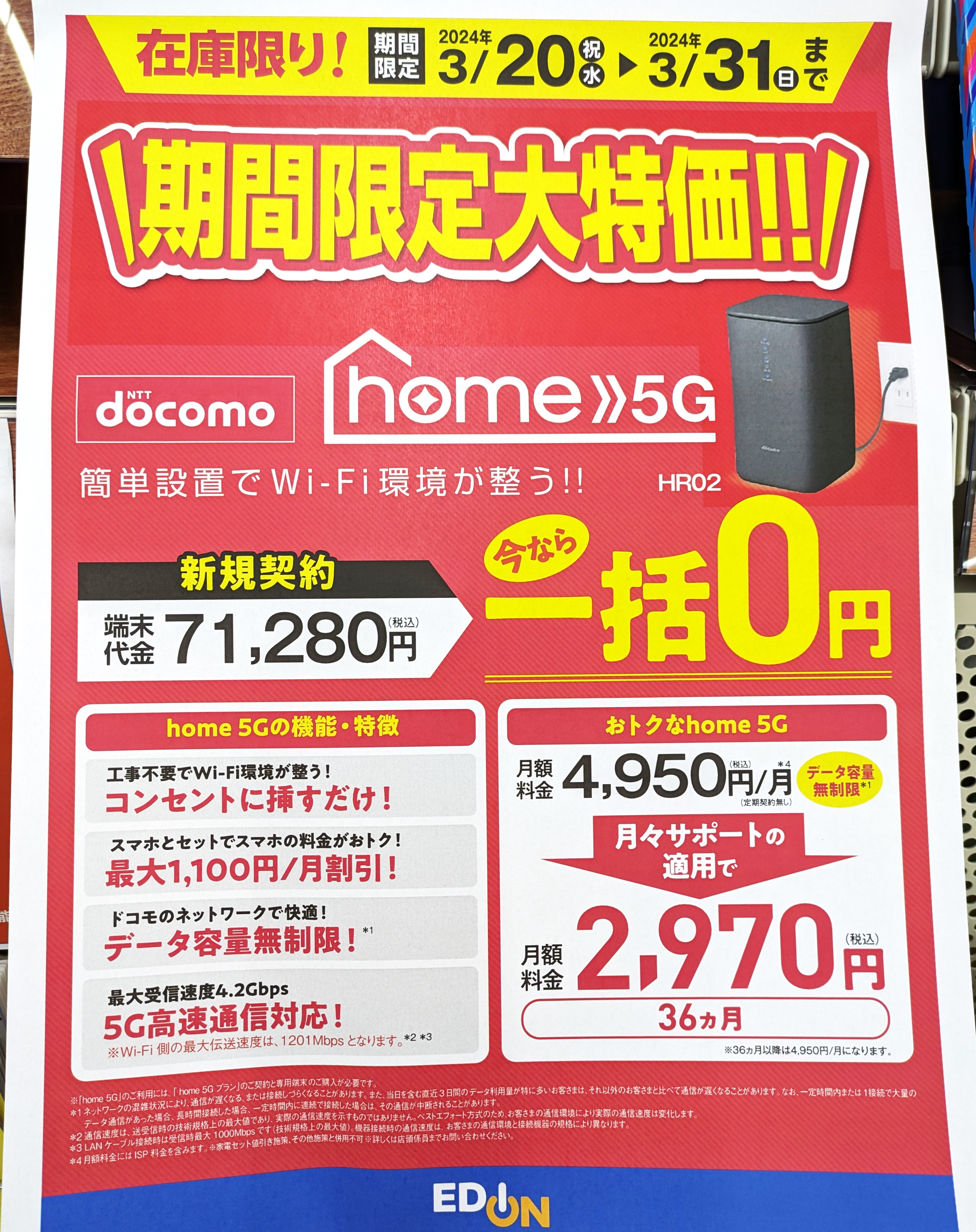エディオンでは、2023年3月発売のドコモ5Gホームルーター「home 5G HR02(税込71,280円)」が、新規契約で一括0円の年度末最終特価となっています。事務手数料は3,850円(税込)、3/31(日)まで。