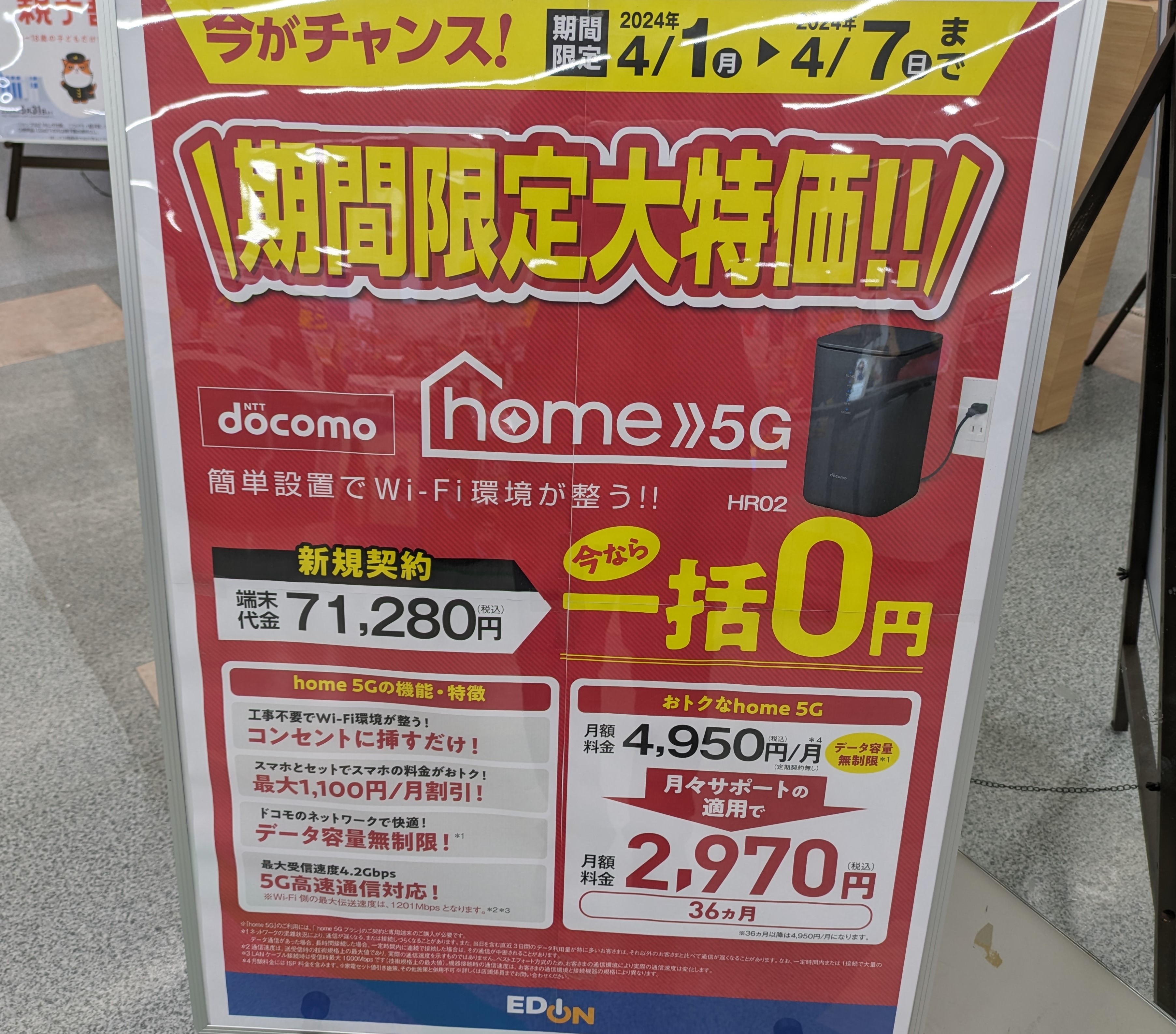 エディオンでは、2023年3月発売のドコモ5Gホームルーター「home 5G HR02(税込71,280円)」が、新規契約で一括0円となっています。事務手数料は3,850円(税込)、4/7(日)まで。