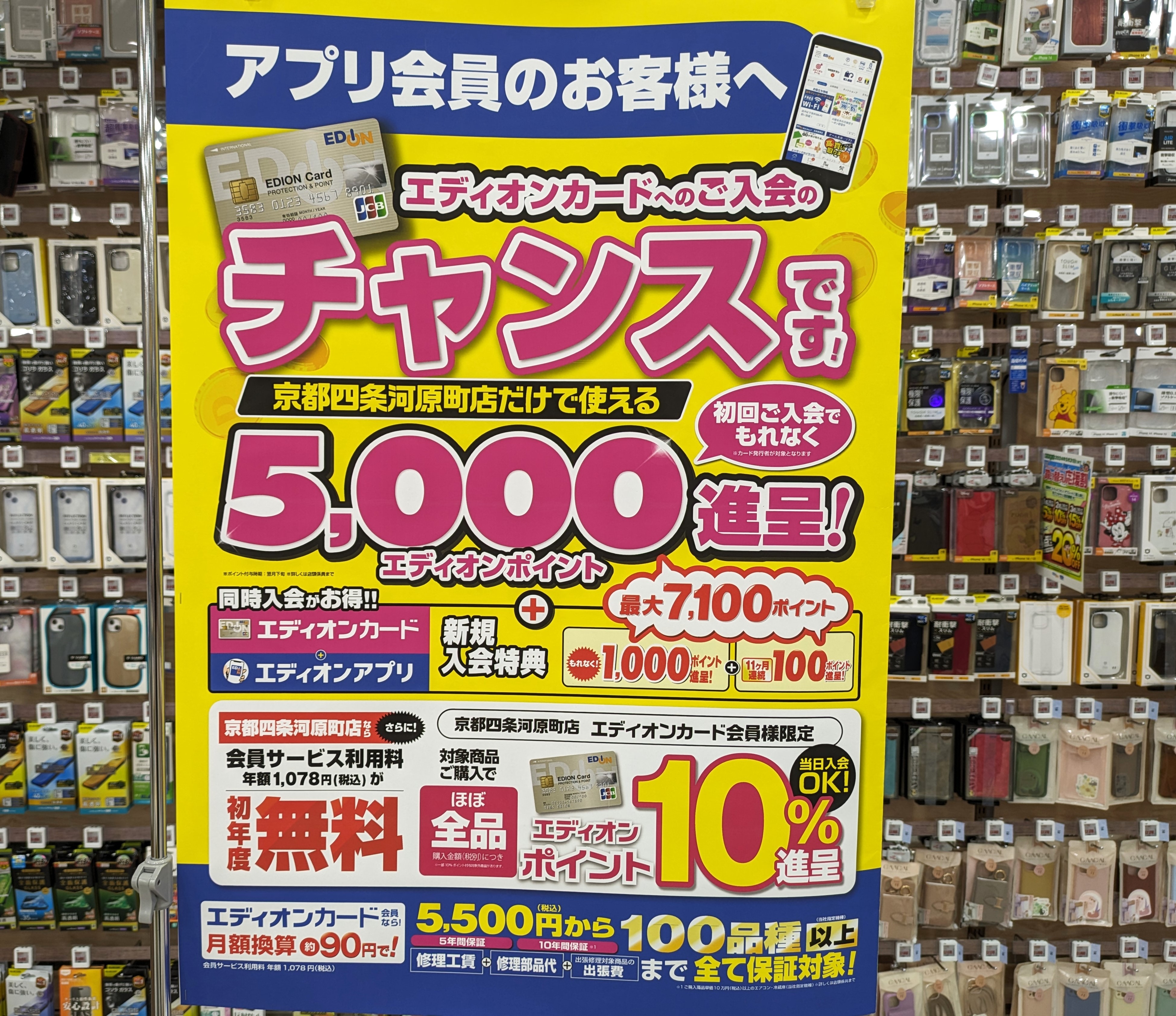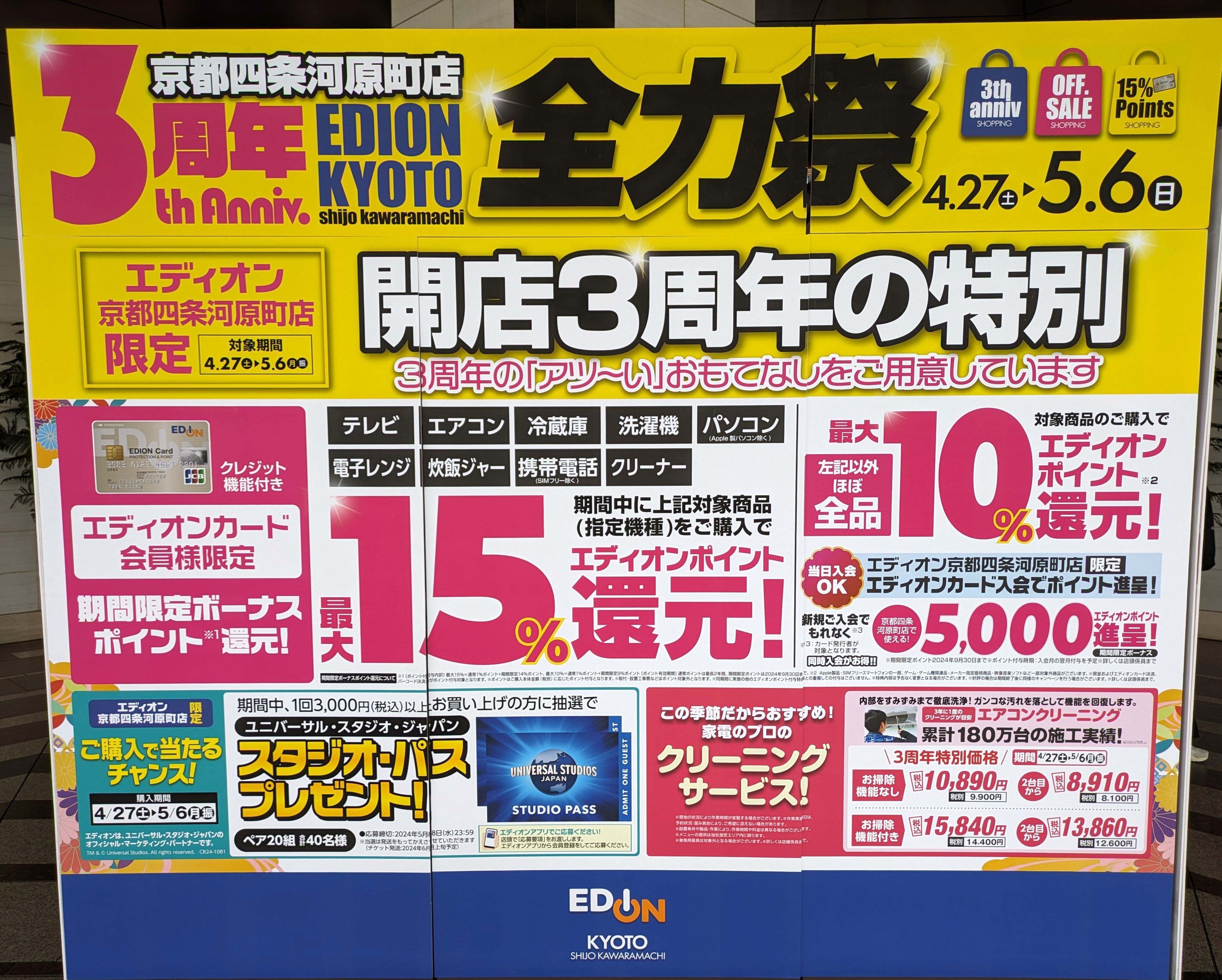 エディオン京都四条河原町店では、恒例、エディオンクレジットカード会員限定で15%エディオンポイント還元(税抜価格に対して)実施中です。5/6(日)まで。