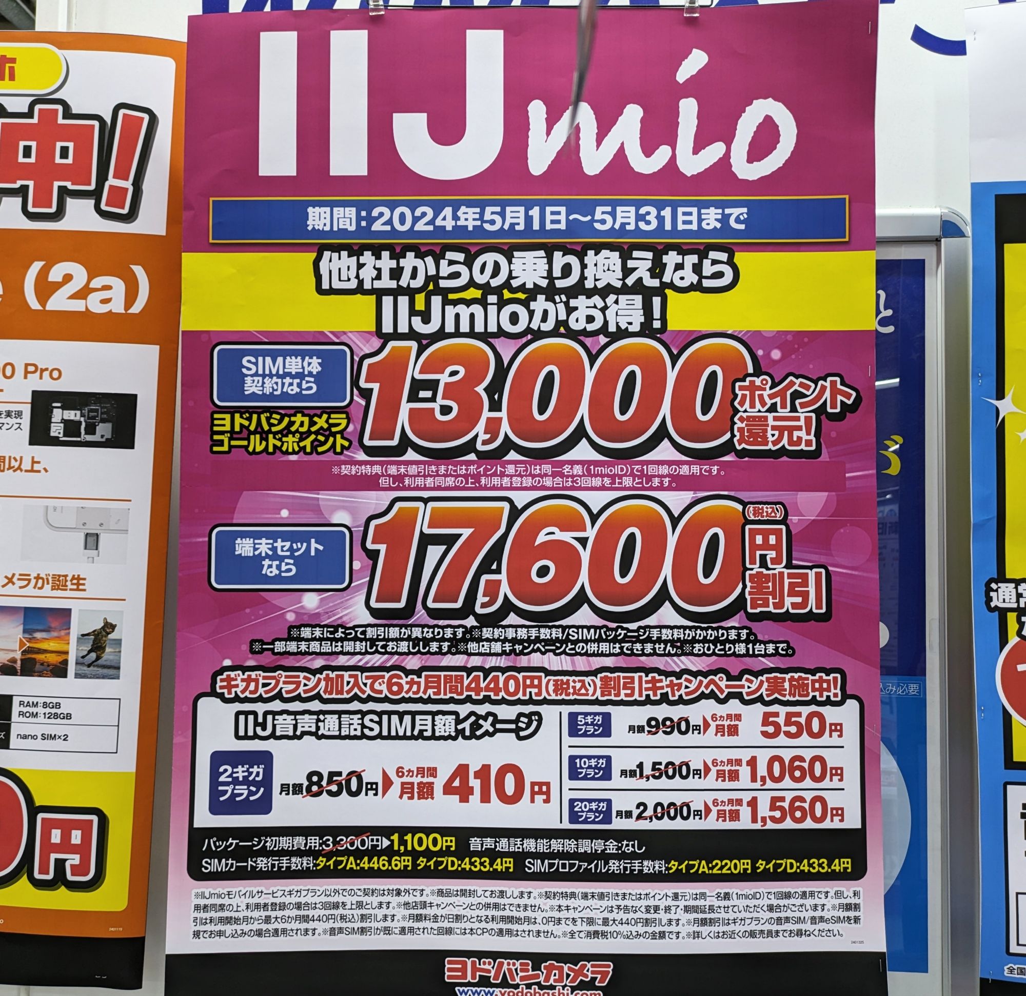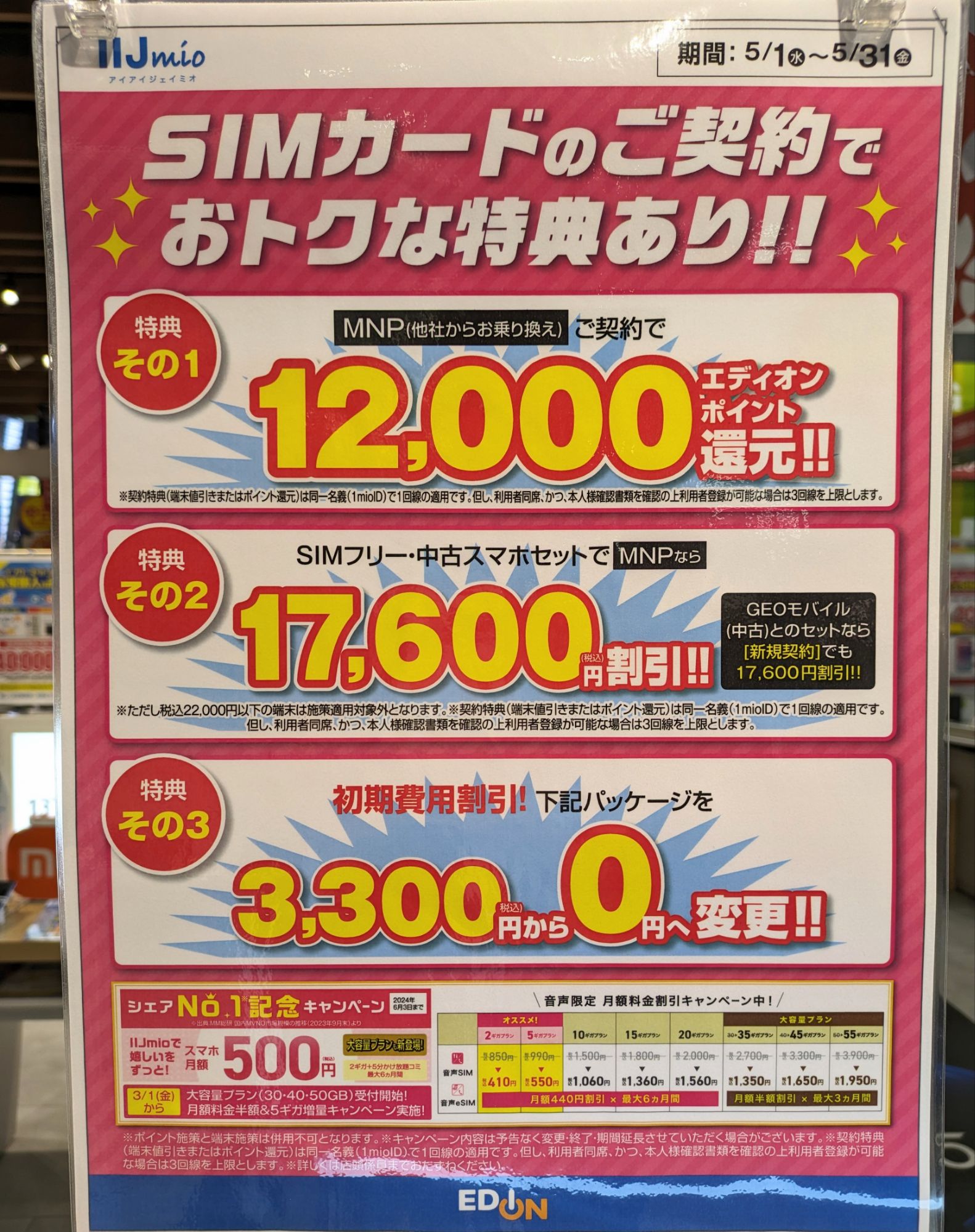 2024年5月1日(水)、エディオンではIIJmioへのSIMのみMNPで12,000ポイント還元となっています。事務手数料は0円。5/31(金)まで。4月より2,000ポイント減です。