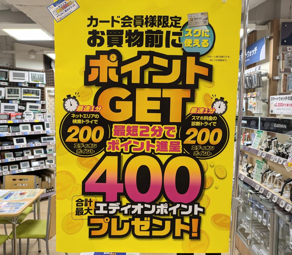 【9/16(月)まで】エディオンで400ポイントプレゼント 2024 9/15 その他 2024年9月15日 当ページにはアフィリエイト広告が含まれています。 ポップは京都四条河原町店2Fです。なんば本店では気付きませんでしたが、実施されているのか否かは不明です。 若干の勧誘は受けますが、400ポイントはもらえますので。カード会員のほか、アプリ会員も対象。 2027年3月末日までの期間限定ポイント。 その他 よかったらシェアしてね! URLをコピーしました! URLをコピーしました! この記事を書いた人 Sakura R5G ケータイ特価情報をお届けします。 遠慮なくコメント頂ければ結構ですが、コメントは私が承認するまで表示されませんので、ご注意下さい。 ※2024年7月1日より、参考程度の投稿以外はX(旧ツイッター)に投稿しようと思っています。 人気記事 ワイモバイル 【8/14(木)より】価格(再)更新、ワイモバイル「Google Pixel 8a」が機種変更で49,536円にPayPay還元/事務手数料0円/ヤフーショッピング店 2025年8月14日 ワイモバイル 【1/21(水)より】ワイモバイル「iPhone 13(認定中古品)」、機種変更一括29,520円が再開/事務手数料3,850円/オンラインストア 2026年1月21日 楽天モバイル 【2025/12版】楽天モバイル「nubia S2R」や「Galaxy A25 5G」がMNP一括1円/事務手数料0円 2025年12月2日 ドコモ 【2025/8版】ahamoへのSIMのみMNPで20,000dポイント(分割進呈)/事務手数料0円/NTTドコモ 2025年8月10日 楽天モバイル 【7/1(火)より】楽天モバイルへのMNPで▲22,000円割引/「Nothing Phone (3a)」が一括32,890円など/事務手数料0円 2025年7月1日 新着記事 【2026/2版】IIJmio、端末のみ特価「Galaxy A36 5G」が32,800円 【2/19(木)まで】ドコモ「Galaxy A25」「AQUOS wish5」の機種変更一括1円が継続中/12ヵ月条件有り/事務手数料4,950円 【2026/2版】ワイモバイル「iPhone 16e」のMNP割引は大幅減(返却1円は継続) コメント コメントする コメントをキャンセルコメント ※ 名前 メール サイト 新しいコメントをメールで通知 新しい投稿をメールで受け取る