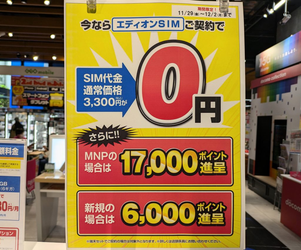 【12/2(月)まで】エディオンSIMへのMNPで17,000ポイント還元/事務手数料0円/ビッグローブ 2024 11/30 SIMフリー 2024年11月30日 当ページにはアフィリエイト広告が含まれています。 エディオンなんば本店では、エディオンSIMことビッグローブへのMNPで17,000ポイント還元となっています。 au回線で1,000ポイント増かと思われます。事務手数料は0円、12/2(月)まで。 SIMフリー よかったらシェアしてね! URLをコピーしました! URLをコピーしました! この記事を書いた人 Sakura R5G ケータイ特価情報をお届けします。 遠慮なくコメント頂ければ結構ですが、コメントは私が承認するまで表示されませんので、ご注意下さい。 ※2024年7月1日より、参考程度の投稿以外はX(旧ツイッター)に投稿しようと思っています。 人気記事 ワイモバイル 【8/14(木)より】価格(再)更新、ワイモバイル「Google Pixel 8a」が機種変更で49,536円にPayPay還元/事務手数料0円/ヤフーショッピング店 2025年8月14日 ワイモバイル 【2025/11版】ワイモバイル「iPhone 13(認定中古品)」が機種変更一括29,520円/事務手数料3,850円/オンラインストア 2025年11月9日 楽天モバイル 【2025/12版】楽天モバイル「nubia S2R」や「Galaxy A25 5G」がMNP一括1円/事務手数料0円 2025年12月2日 ドコモ 【2025/8版】ahamoへのSIMのみMNPで20,000dポイント(分割進呈)/事務手数料0円/NTTドコモ 2025年8月10日 楽天モバイル 【7/1(火)より】楽天モバイルへのMNPで▲22,000円割引/「Nothing Phone (3a)」が一括32,890円など/事務手数料0円 2025年7月1日 新着記事 【1/10(土)】 Joshin webで「Xiaomi 14T Pro 512GB(パッケージ不良)」が79,800円 【1/15(木)発売】楽天モバイル「Nothing Phone (3a) Lite」が32,890円/はじめて申し込み&MNPで16,000ポイント/2回線目以降は新規で6,000ポイント 【1/13(火)まで】UQモバイル「自宅セット割」適用で10,000ポイント追加還元/ビックカメラ コメント コメントする コメントをキャンセルコメント ※ 名前 メール サイト 新しいコメントをメールで通知 新しい投稿をメールで受け取る