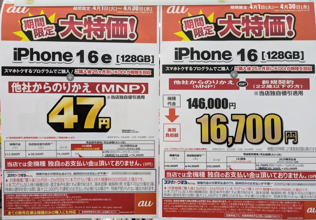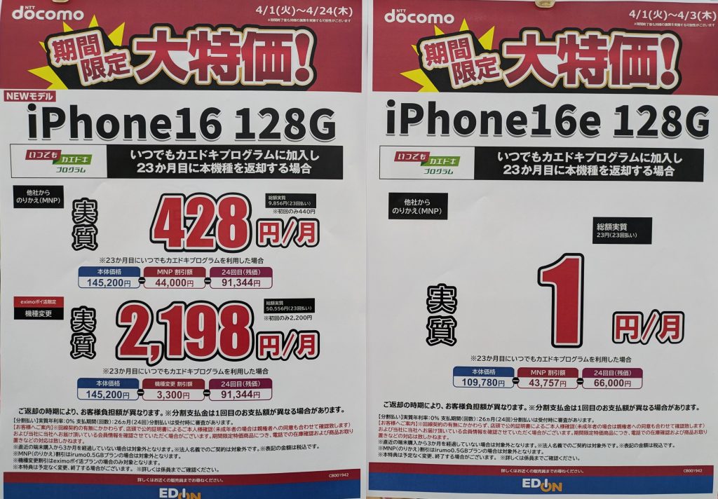 【2025/4版】ドコモ「iPhone 16e」がMNPで66,023円/事務手数料3,850円/エディオン 2025 3/31 ドコモ 2025年3月31日 当ページにはアフィリエイト広告が含まれています。 エディオンでは、引き続き2/28(金)発売の「iPhone 16e 128GB(税込109,780円)」が、MNPで▲43,757円割引になり、総額66,023円(税込)となっています。事務手数料は3,850円(税込)。 ドコモ よかったらシェアしてね! URLをコピーしました! URLをコピーしました! この記事を書いた人 Sakura R5G ケータイ特価情報をお届けします。 遠慮なくコメント頂ければ結構ですが、コメントは私が承認するまで表示されませんので、ご注意下さい。 ※2024年7月1日より、参考程度の投稿以外はX(旧ツイッター)に投稿しようと思っています。 人気記事 ワイモバイル 【8/14(木)より】価格(再)更新、ワイモバイル「Google Pixel 8a」が機種変更で49,536円にPayPay還元/事務手数料0円/ヤフーショッピング店 2025年8月14日 ワイモバイル 【2025/11版】ワイモバイル「iPhone 13(認定中古品)」が機種変更一括29,520円/事務手数料3,850円/オンラインストア 2025年11月9日 楽天モバイル 【2025/12版】楽天モバイル「nubia S2R」や「Galaxy A25 5G」がMNP一括1円/事務手数料0円 2025年12月2日 ドコモ 【2025/8版】ahamoへのSIMのみMNPで20,000dポイント(分割進呈)/事務手数料0円/NTTドコモ 2025年8月10日 楽天モバイル 【7/1(火)より】楽天モバイルへのMNPで▲22,000円割引/「Nothing Phone (3a)」が一括32,890円など/事務手数料0円 2025年7月1日 新着記事 【1/10(土)】 Joshin webで「Xiaomi 14T Pro 512GB(パッケージ不良)」が79,800円 【1/15(木)発売】楽天モバイル「Nothing Phone (3a) Lite」が32,890円/はじめて申し込み&MNPで16,000ポイント/2回線目以降は新規で6,000ポイント 【1/13(火)まで】UQモバイル「自宅セット割」適用で10,000ポイント追加還元/ビックカメラ コメント コメントする コメントをキャンセルコメント ※ 名前 メール サイト 新しいコメントをメールで通知 新しい投稿をメールで受け取る