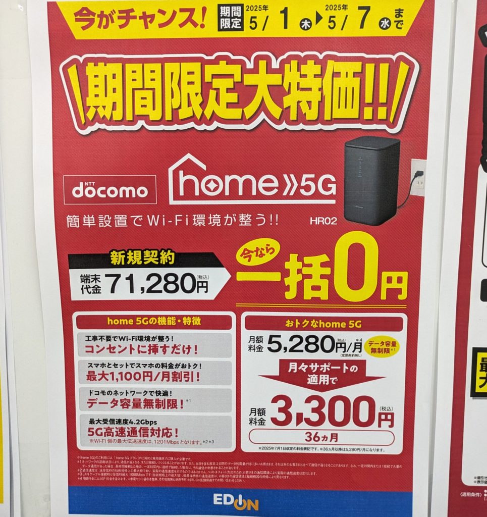 エディオンではドコモ「home 5G HR02(税込71,280円)」が新規一括0円(税込)となっています。事務手数料は3,850円(税込)、5/7(水)まで。