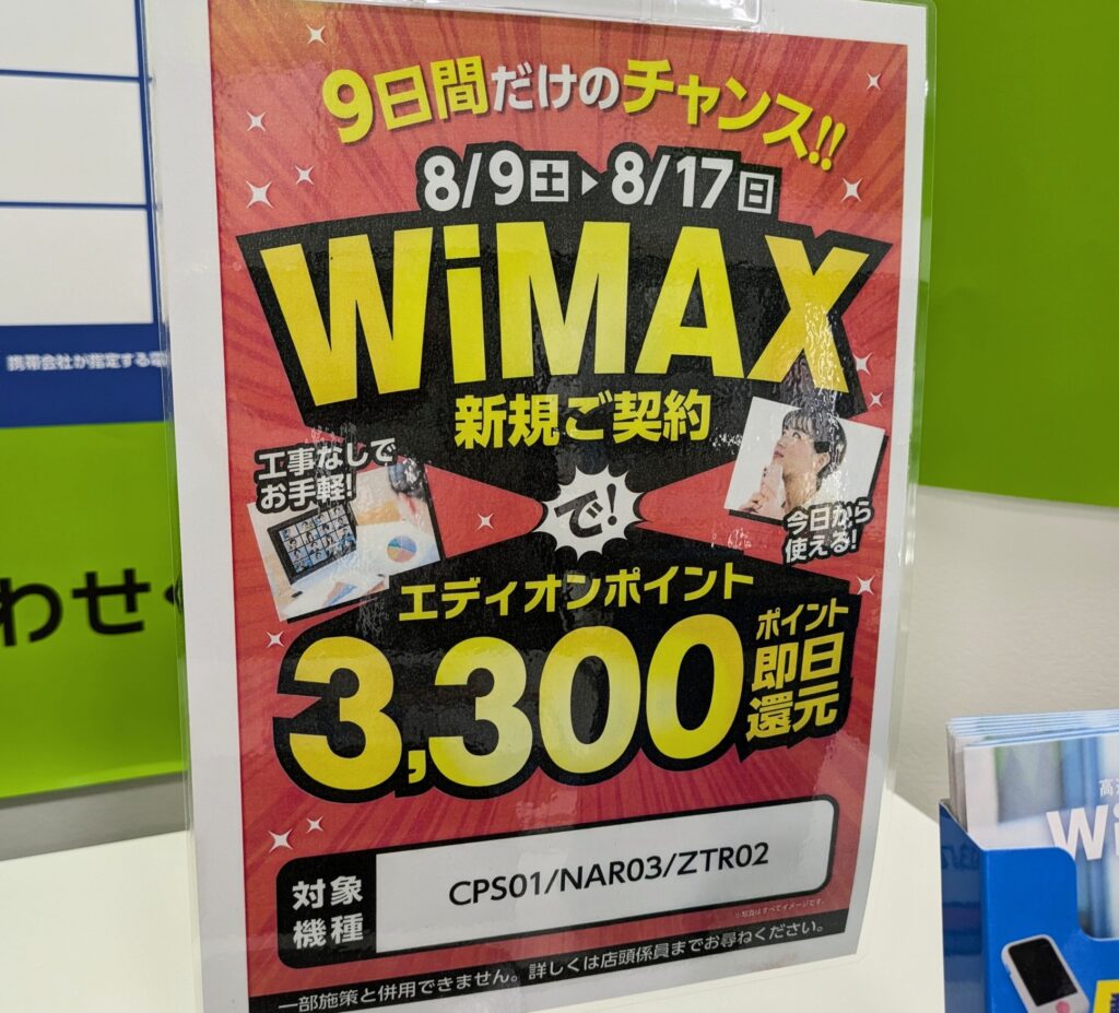 エディオンではWiMAX新規契約で3,300ポイント追加還元となっています。8/17(日)まで。