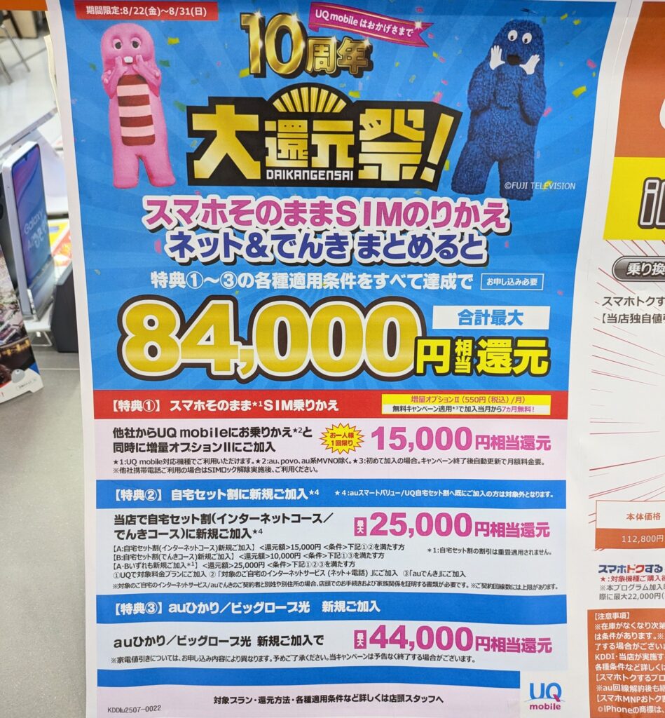 エディオンやビックカメラでは、引き続きUQモバイルの自宅セット割適用で15,000ポイント前後の追加還元となっています。