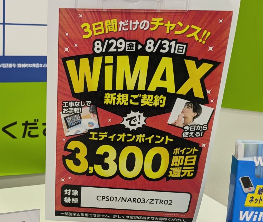 エディオンではWiMAX新規契約で3,300ポイント追加還元となっています。8/31(日)まで。お盆の時期も同じキャンペーンが実施されていましたし、今後も都度続くのかもしれません。