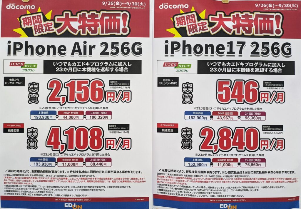エディオンでは、9/19(金)発売のドコモ「iPhone 17 256GB(税込152,900円)」が、MNPで▲43,967円割引になり、総額108,933円(税込)となっています。