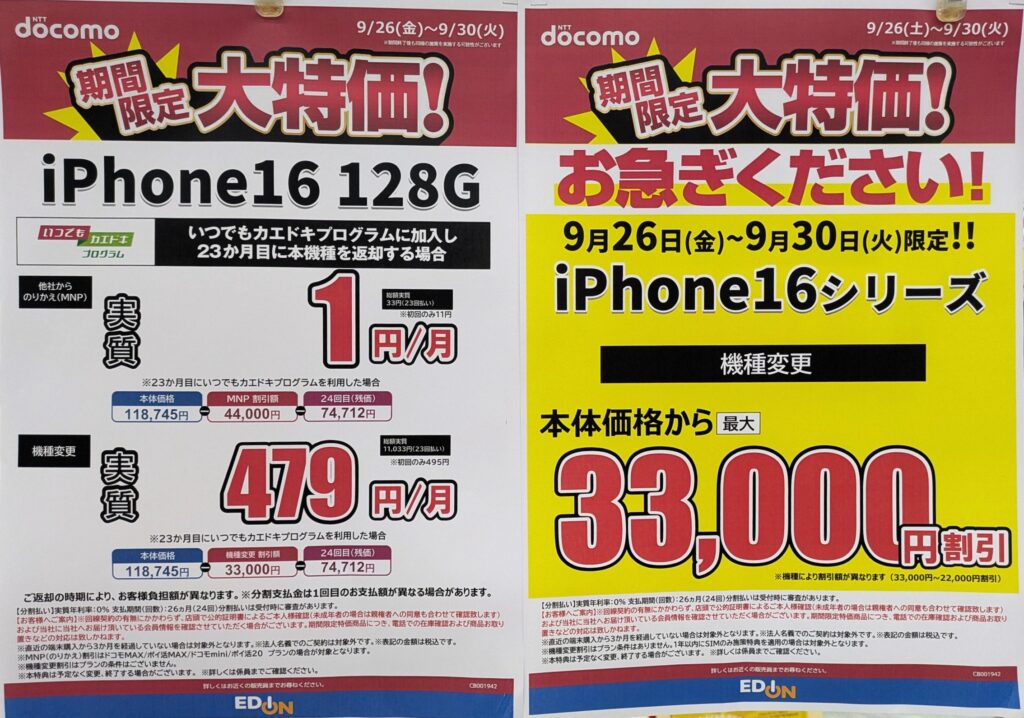 エディオン等の量販店では、「iPhone 16 128GB(税込118,745円)」が機種変更で▲33,000円割引になり、総額85,745円(税込)となっています。事務手数料は4,950円(税込)、9/30(火)まで。