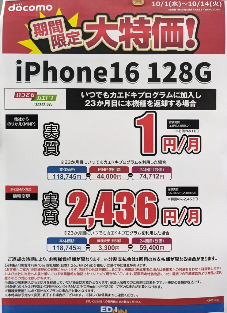 2025年10月1日(水)、量販店で実施されていた「iPhone 16 128GB(税込118,745円)」の、機種変更▲3.3~4.4万円割引ですが、一旦終了です。今後も復活することはないのかもしれません。