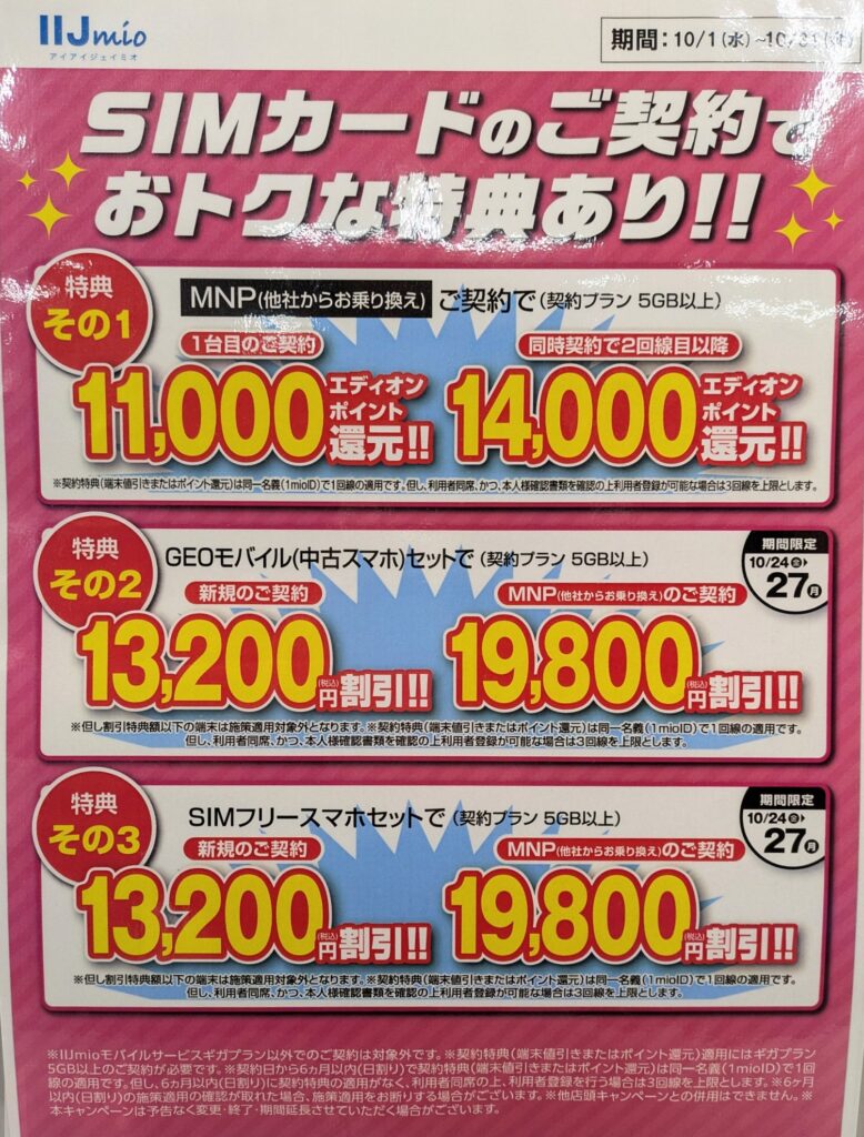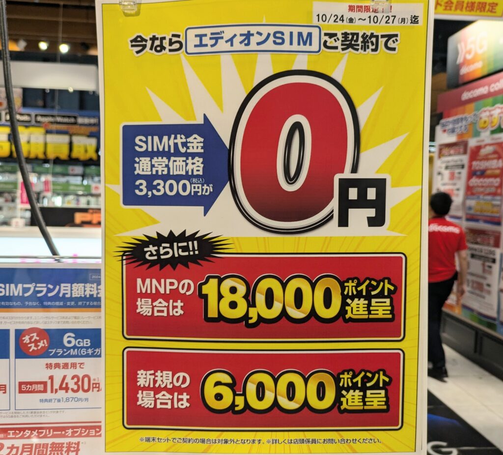 エディオンでは、エディオンSIMことビッグローブへのMNPで18,000ポイント還元となっています。