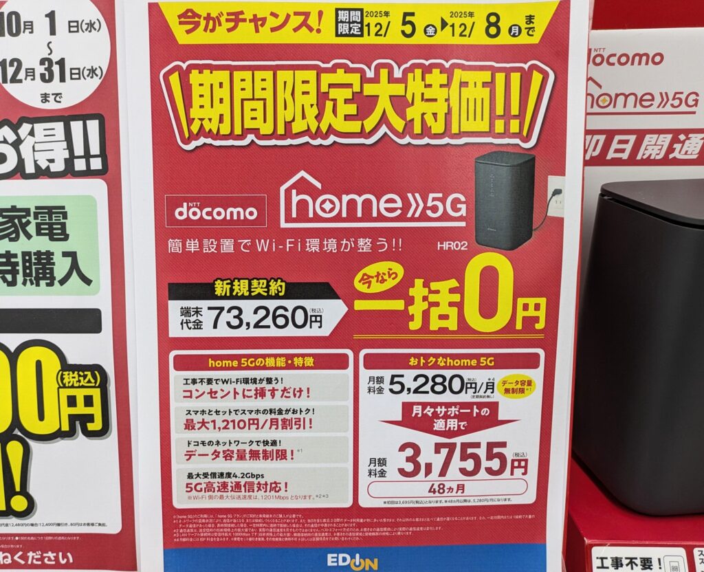 エディオンでは、ドコモ「home 5G HR02(税込73,260円)」が新規一括0円となっています。