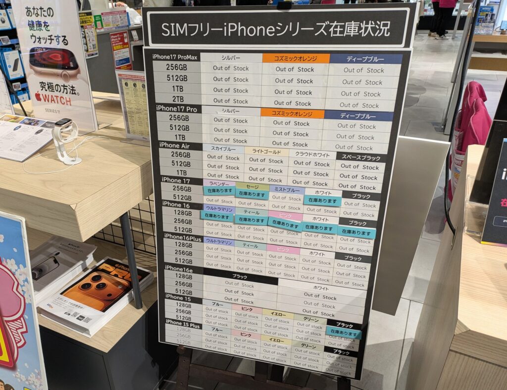 在庫状況は1/17(土)時点、なんば本店です。今はドコモ・ahamoの乗り換え▲4.4万割引が人気だと思いますが、SIMフリー版も「iPhone 17(無印)」が入荷しています。