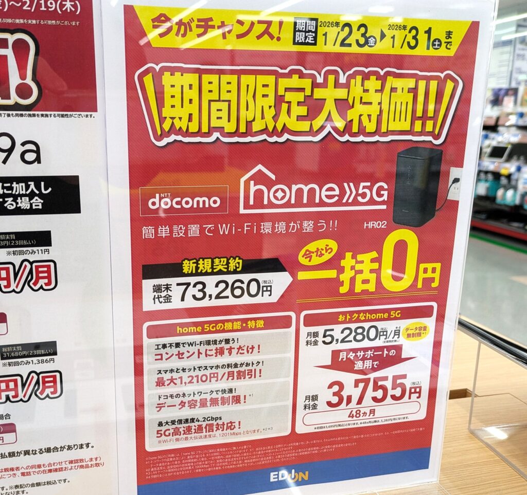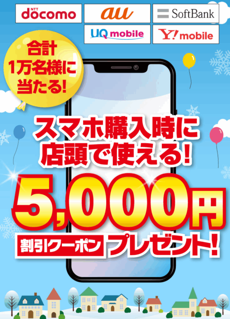 エディオンでは、キャリアスマホ(サブブランド含む、楽天モバイルを除く)の購入時に使用出来る5,000円OFFクーポン配布中です。合計1万名が当選しますので、応募すればほぼ当選します。エディオンアプリからご応募ください。