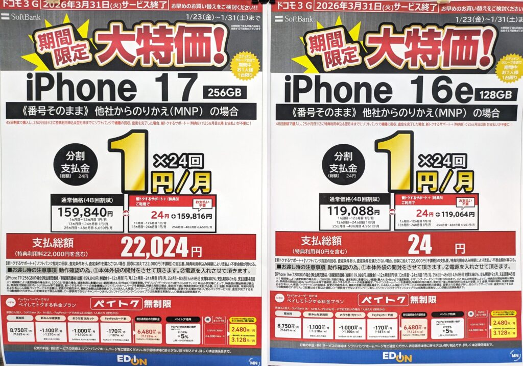 ただし、ソフトバンクについてはMNPであっても契約時の端末割引がない機種も多いので(iPhone 17 等)、そのようなケースでは5,000円相当還元が可能です。