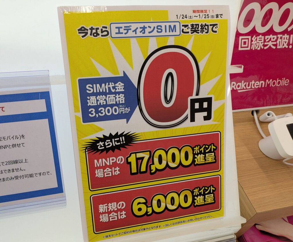 エディオンでは、エディオンSIMことビッグローブへのMNPで17,000ポイント還元となっています。