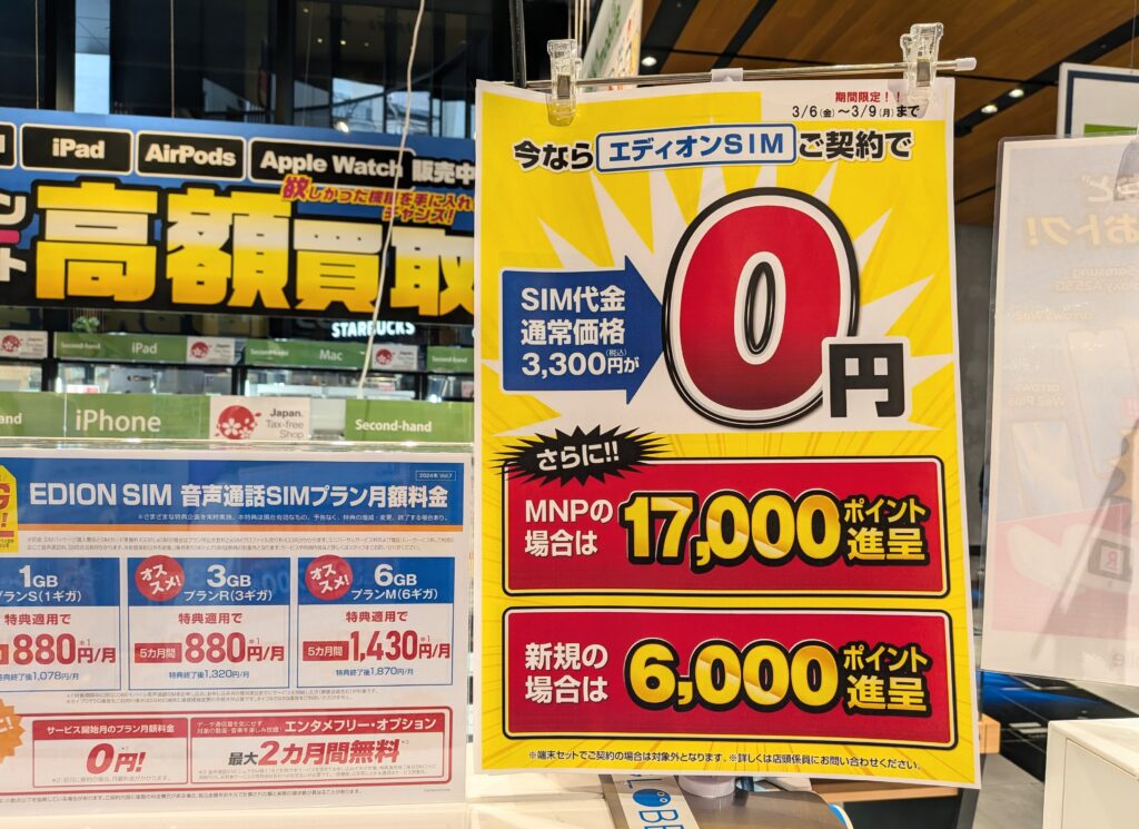 エディオンでは、エディオンSIMことビッグローブへのMNPで17,000ポイント還元となっています。