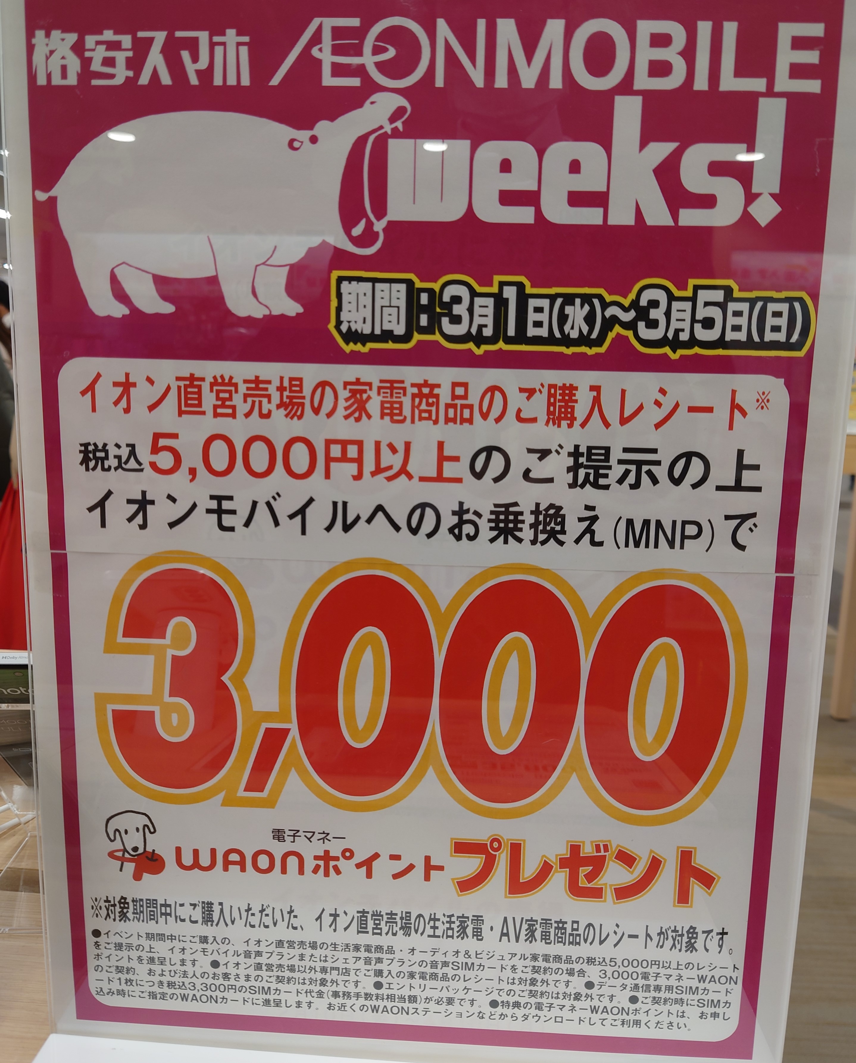 イオンモバイル茨木では、イオン直営売場の家電商品5,000円以上お買い物レシート提示&イオンモバイルへのMNPで3,000ポイント還元となっています。事務手数料は3,300円(税込)。対象期間は3/1(水)~3/5(日)まで。