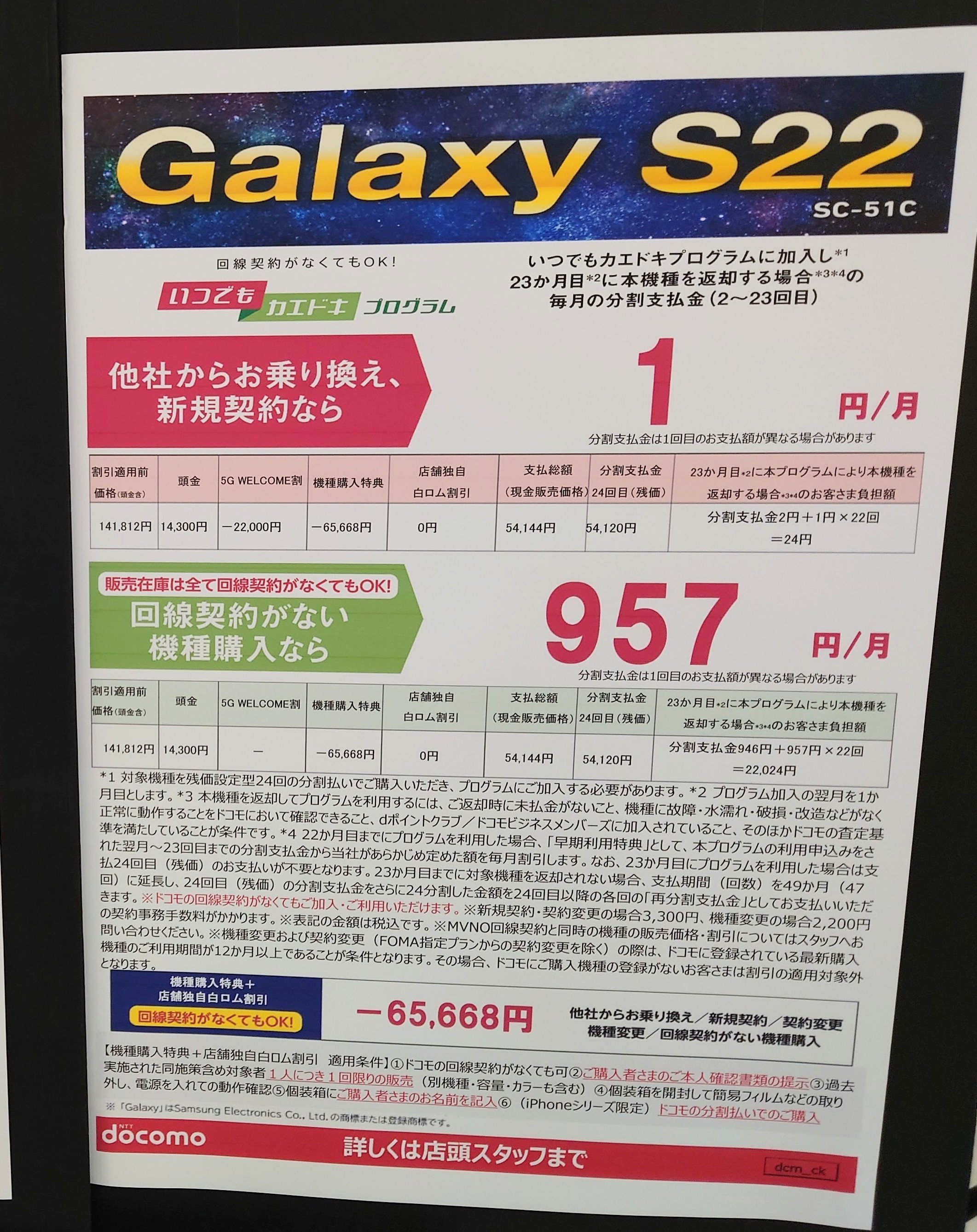 2023年4月29日(土)、イオンモール茨木出張所では2022年4月発売のドコモ「Galaxy S22(頭金含・税込141,812円)」がMNP総額54,144円(税込)となっています。事務手数料は3,300円(税込)。4/30(日)まで。