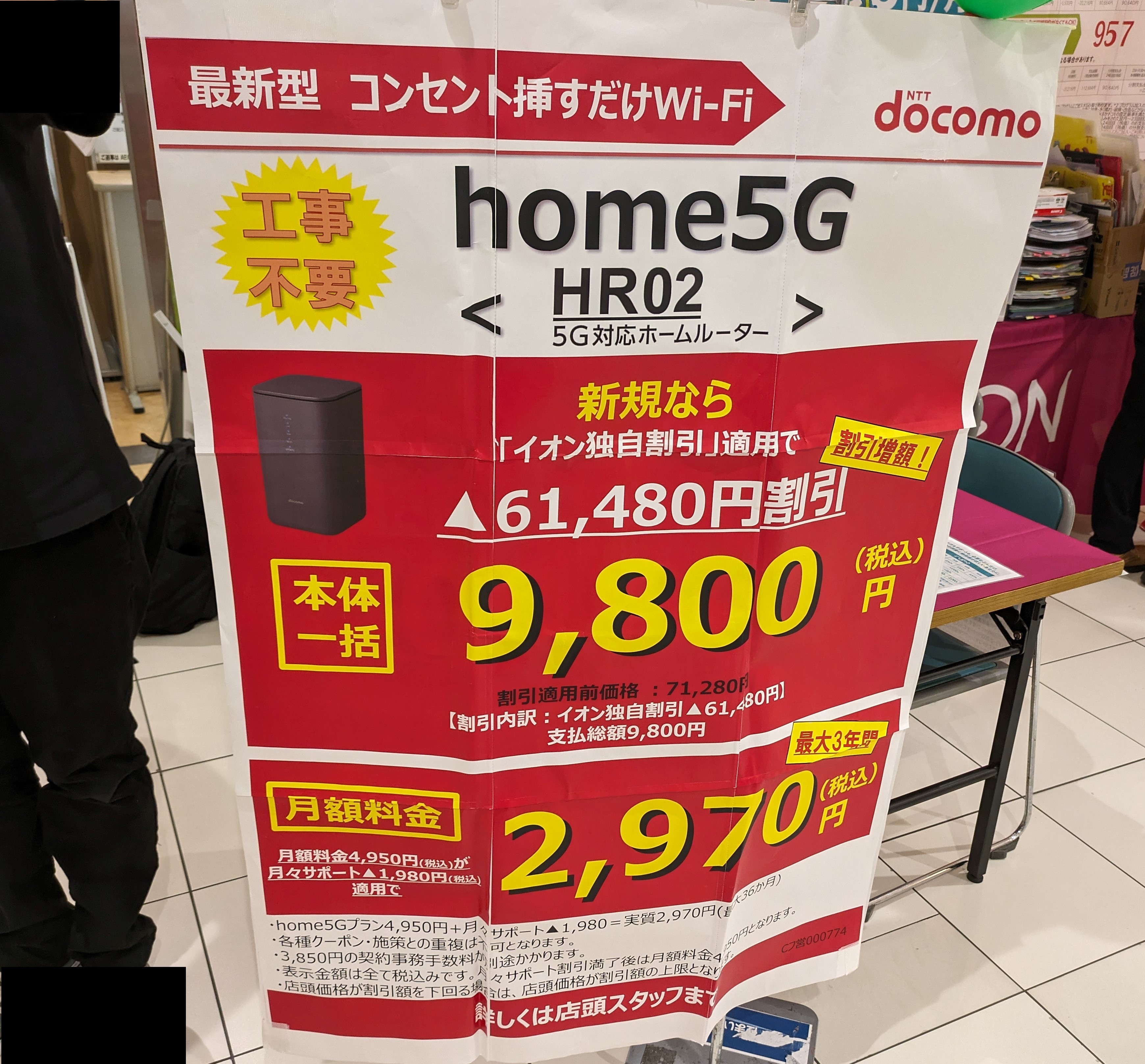 イオンモバイル茨木では、2023年3月発売のドコモ5Gホームルーター「home 5G HR02(税込71,280円)」が、新規契約で61,480円割引となり、一括9,800円(税込)となっています。事務手数料は3,850円(税込)、8/27(日)まで。