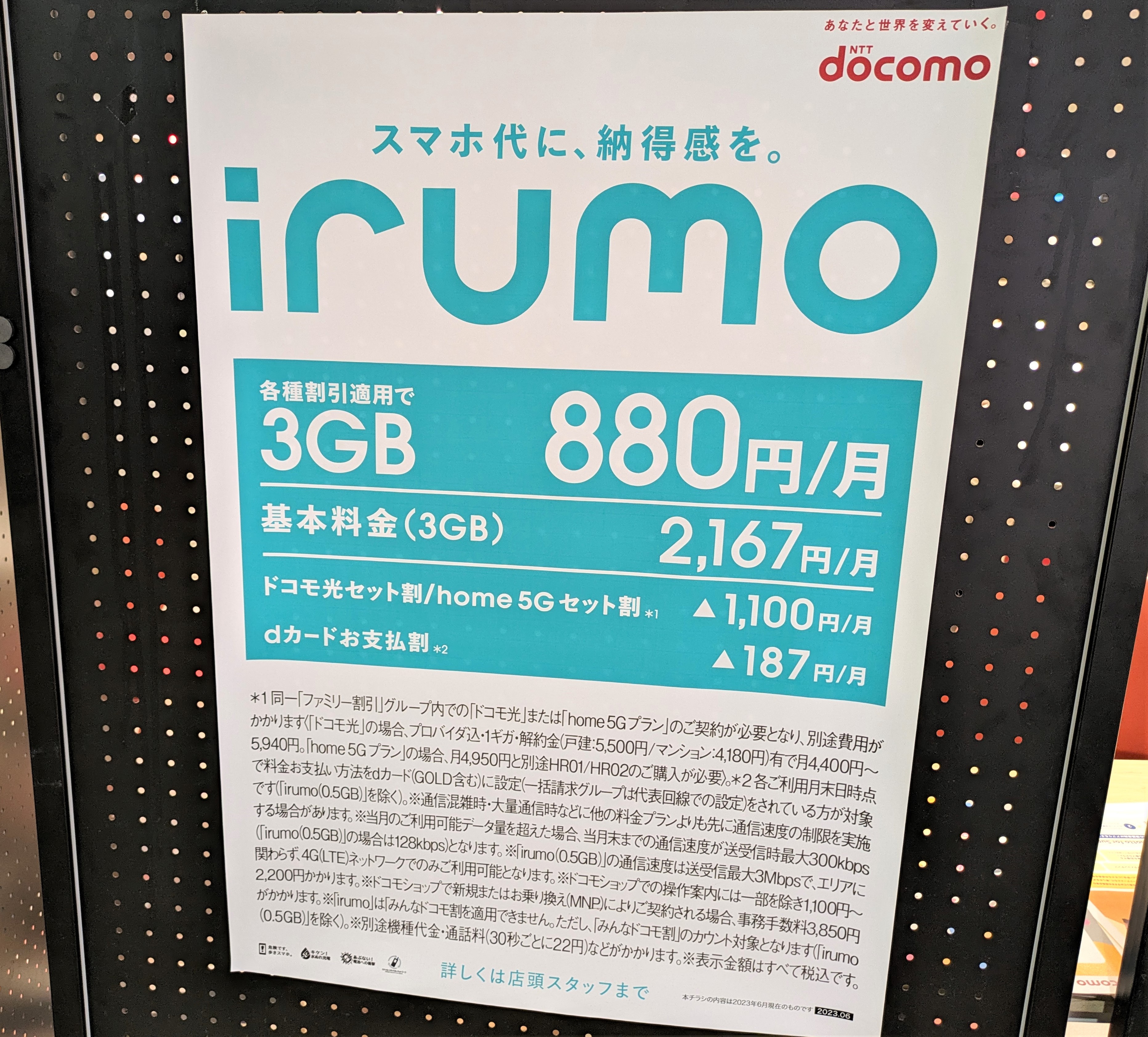 そして大きいのがドコモの新料金プランの割引です。例えばirumoの3GBの通常料金2,167円/月(税込)が、下記のとおり、ドコモ光セット割若しくはhome5Gセット割で▲1,100円、dカードお支払い割で▲187円/月となり、月額880円/月から利用可能です。