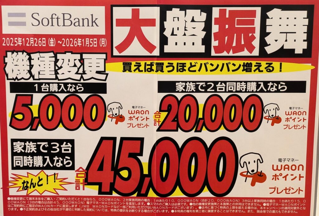 イオンモバイルでは、ソフトバンクの機種変更で、5,000ポイント還元となっています。