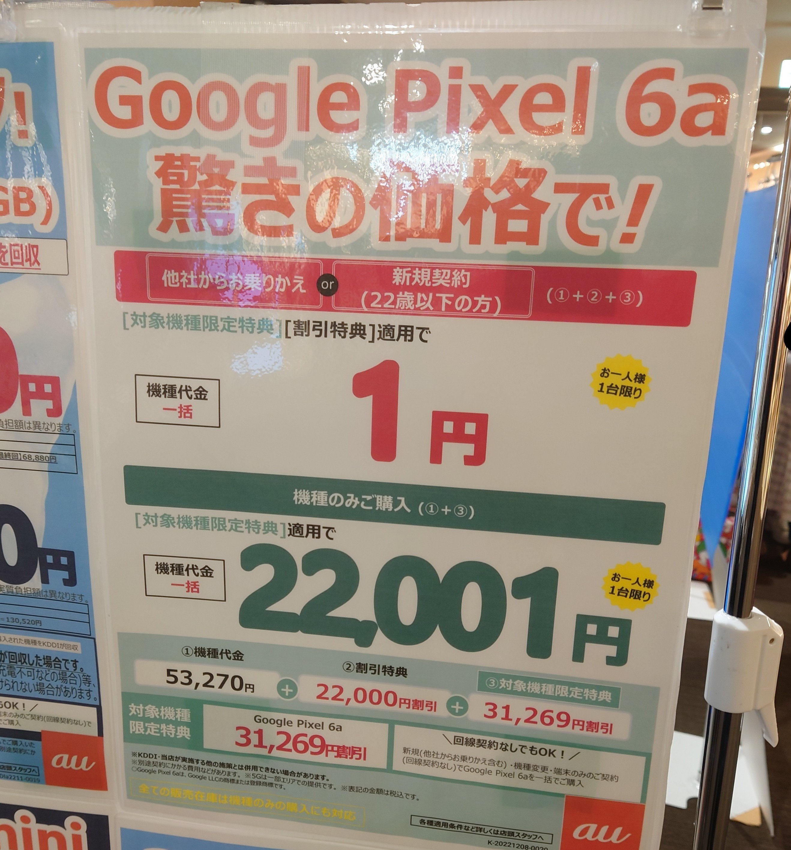 au出張所では、「Google Pixel 6a(税込53,270円)」がMNP若しくはU22新規で一括1円となっています。2/19(日)まで。