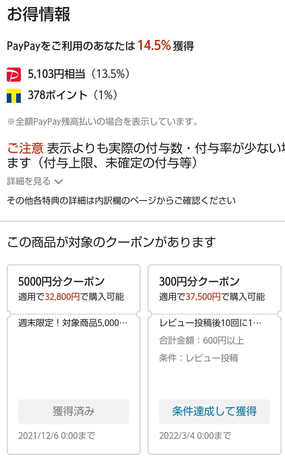 明日は5のつく日(4%還元)、+5%倍!倍!ストア、日曜日誰でも5%(上限1,000円)も付きますので、当然明日を待った方がよさそうにも見えますが、通常価格自体が上がる可能性もあります。一括価格としては本日が最安のような気もします。