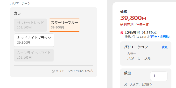 2026年3月3日(火)15:45時点、スターリーブルーとミッドナイトブラックの在庫有り。