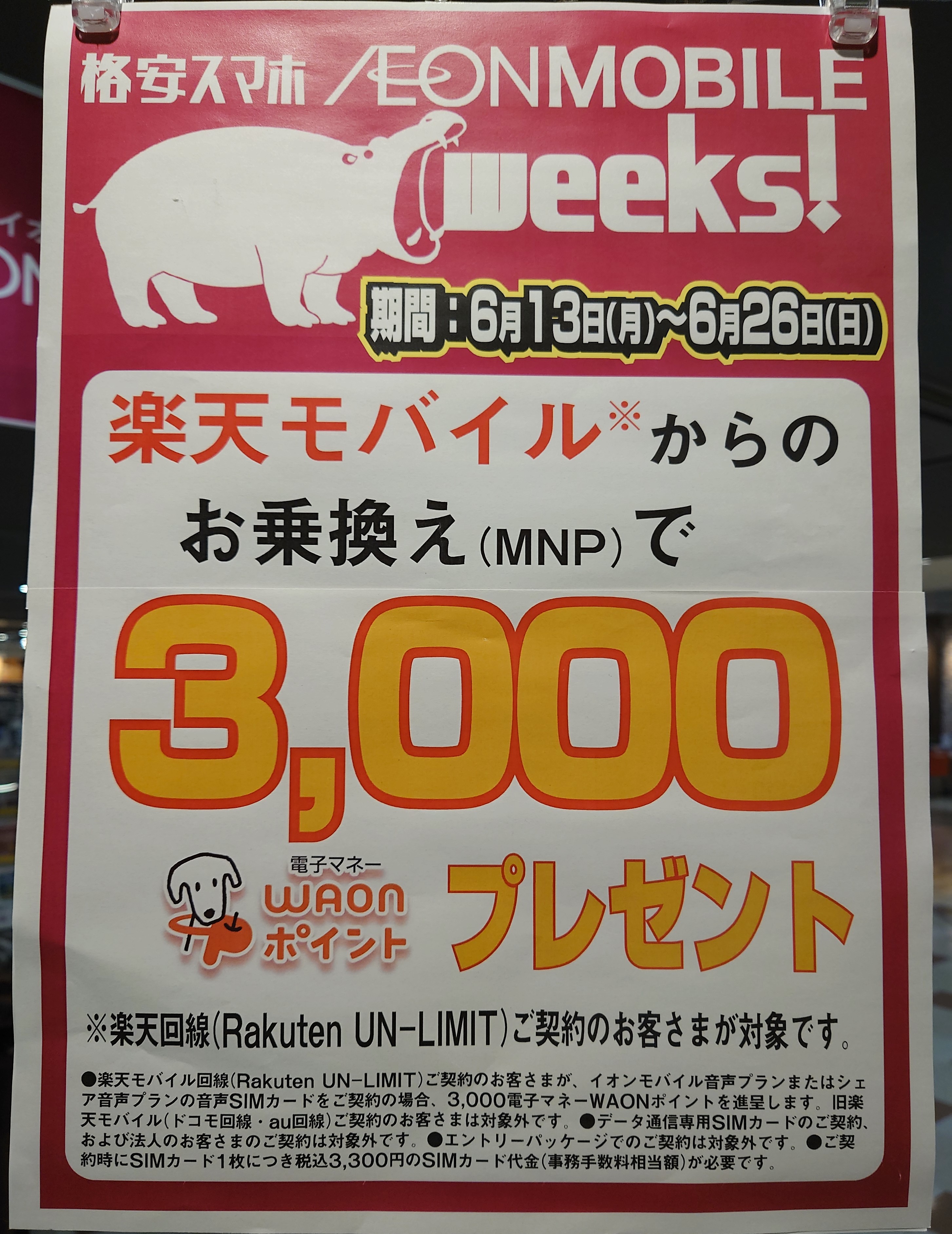 ・乗り換え(MNP)元が楽天モバイル:3,000WAONポイント