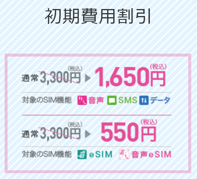 音声SIM契約(スマホ大特価セール)の事務手数料は1,650円(税込)。※音声eSIMの場合は550円(税込)