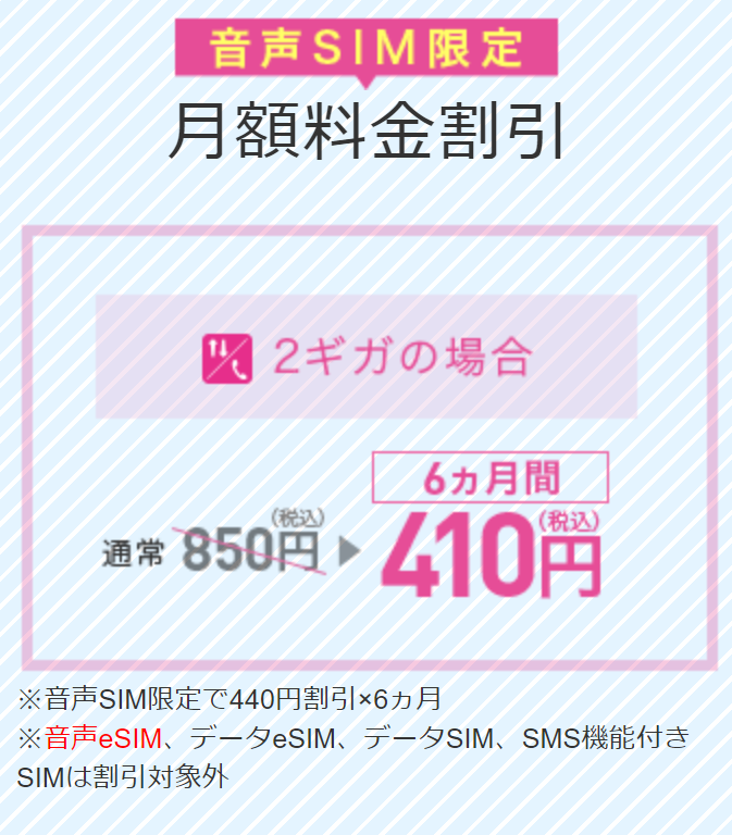 月額料金は、音声2GBプランの場合、6ヵ月間410円/月で利用可能。「音声eSIMは月額料金割引の対象外」です。音声eSIMは、事務手数料は550円と安くなりますが、月額料金割引特典が受けれませんのでご注意下さい。