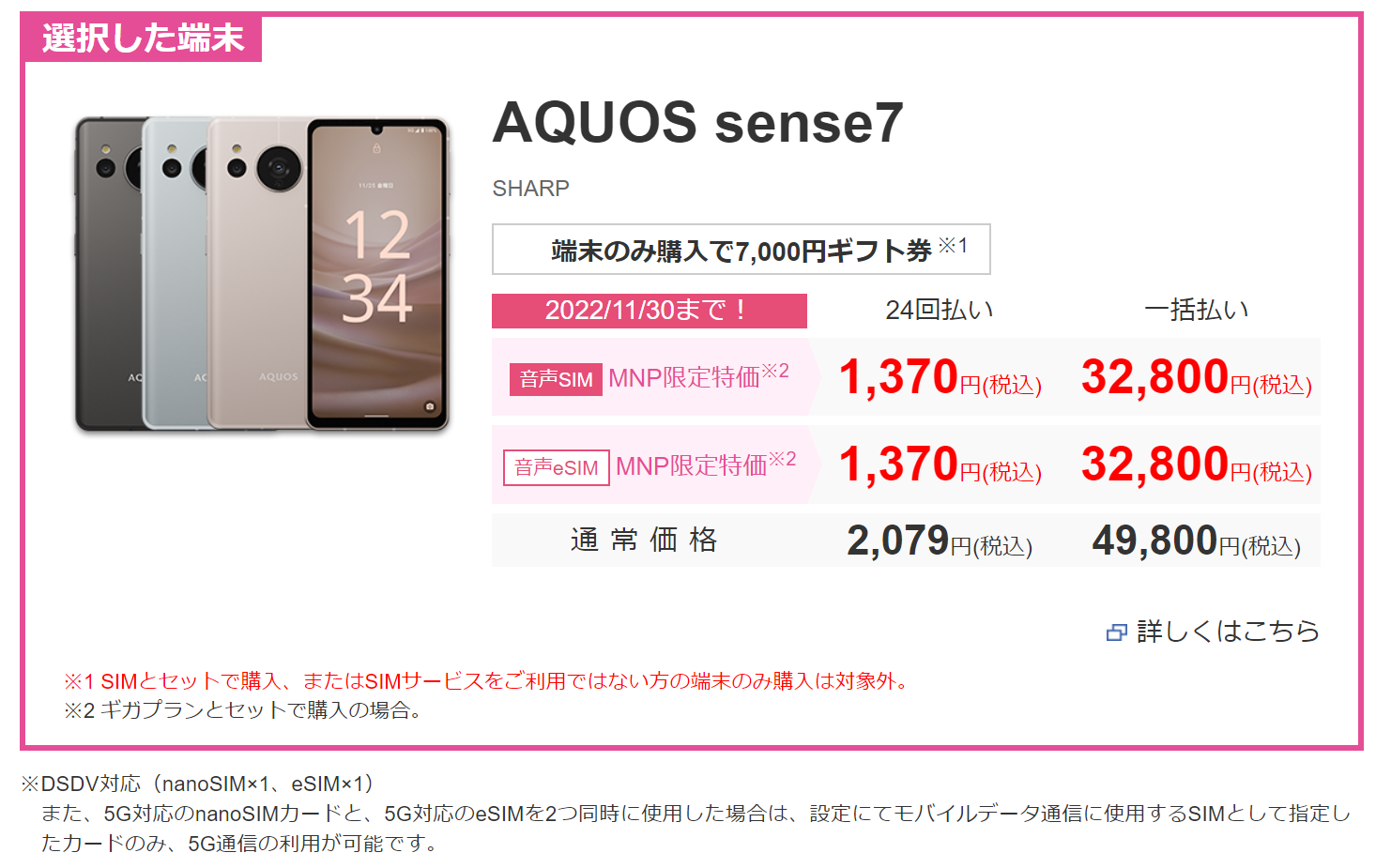 なお、割引前の本体価格(端末のみ購入価格)は49,800円(税込)で、「端末のみ購入した場合」はmio利用者限定(一部プランを除く)で7,000円ギフト券プレゼントとなります。