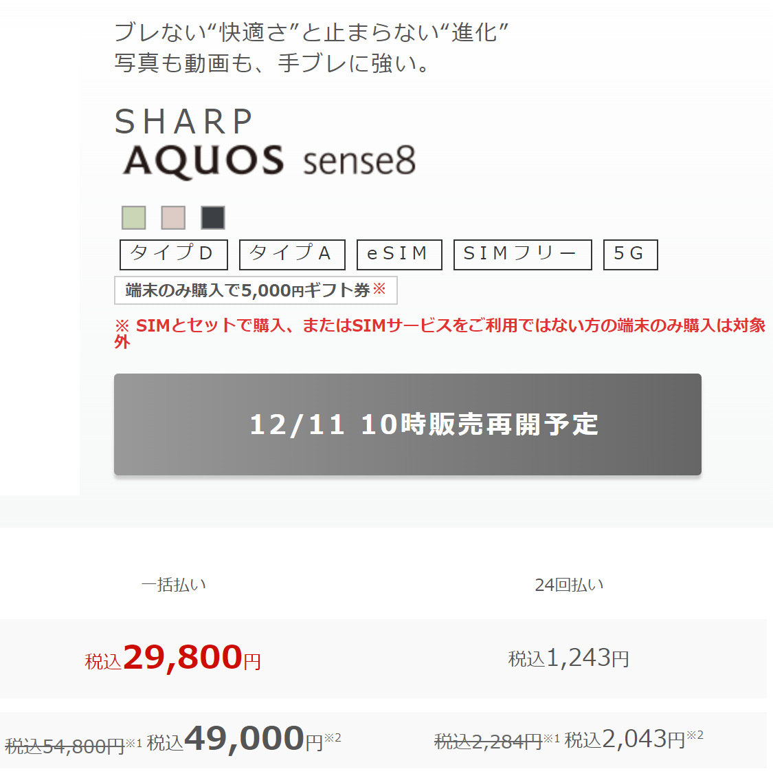 IIJmioでは「AQUOS sense8 SH-M26」SIMフリーが、12/11(月)10:00から再販開始となります。11/27(月)の再販は当日のうちに完売していたようです。