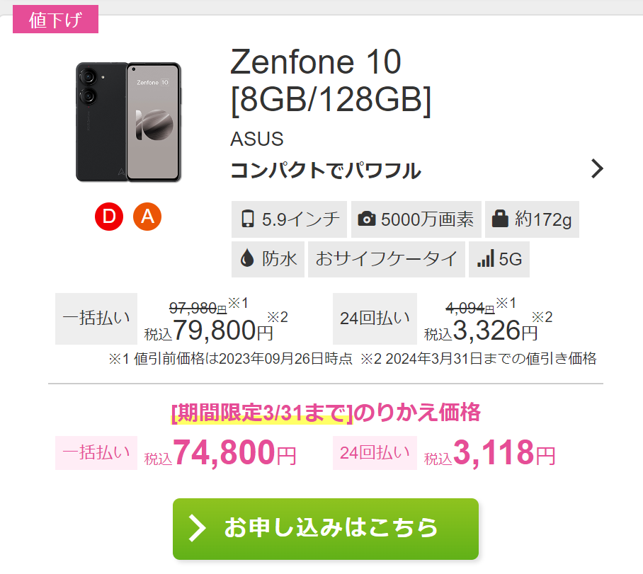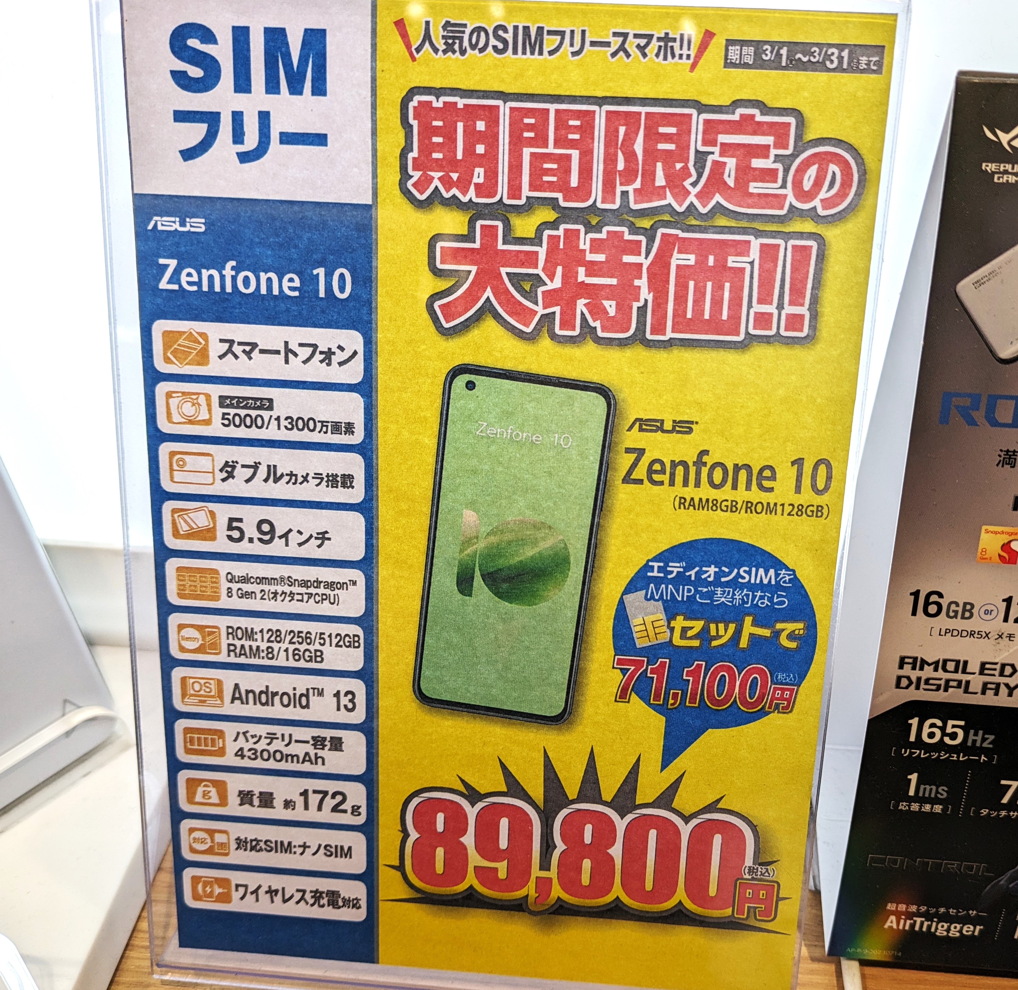2024年3月10日(日)、IIJmioオンラインでは2023年9月発売の「Zenfone 10(8GB/128GB)」が単品79,800円(税込)の特価となっています。 MNPでは一括74,800円(税込)に事務手数料3,300円(税込)ですので、回線契約をする意味がなくなっています。