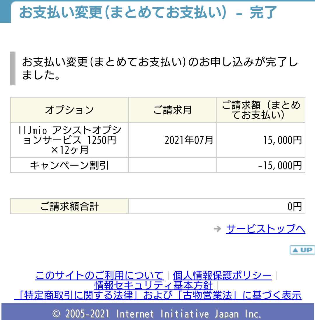 以下、アシストオプションの解約(まとめてお支払い)になります。7月24日契約、翌日25日にオプション解約です。▲15,000円は「税抜表示」です。なお、今回のケースでは回線契約の最低利用期間は8月末日迄です。