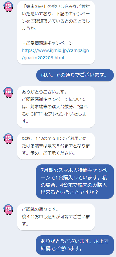 あくまで指定プラン契約中のmio会員が「端末のみ購入」した場合に、ギフト券還元となります。「対象端末購入台数分(既存購入台数を含めて一人5台まで)」適用されます。