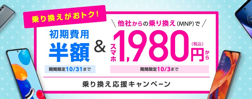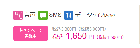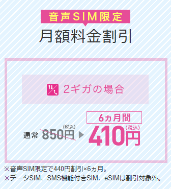 また、乗り換え応援キャンペーンで事務手数料は1,650円(税込)。さらに、音声ギガプランの月額料金が6ヵ月間440円(税込)の割引となります。2GBプランなら410円/月(税込)~。