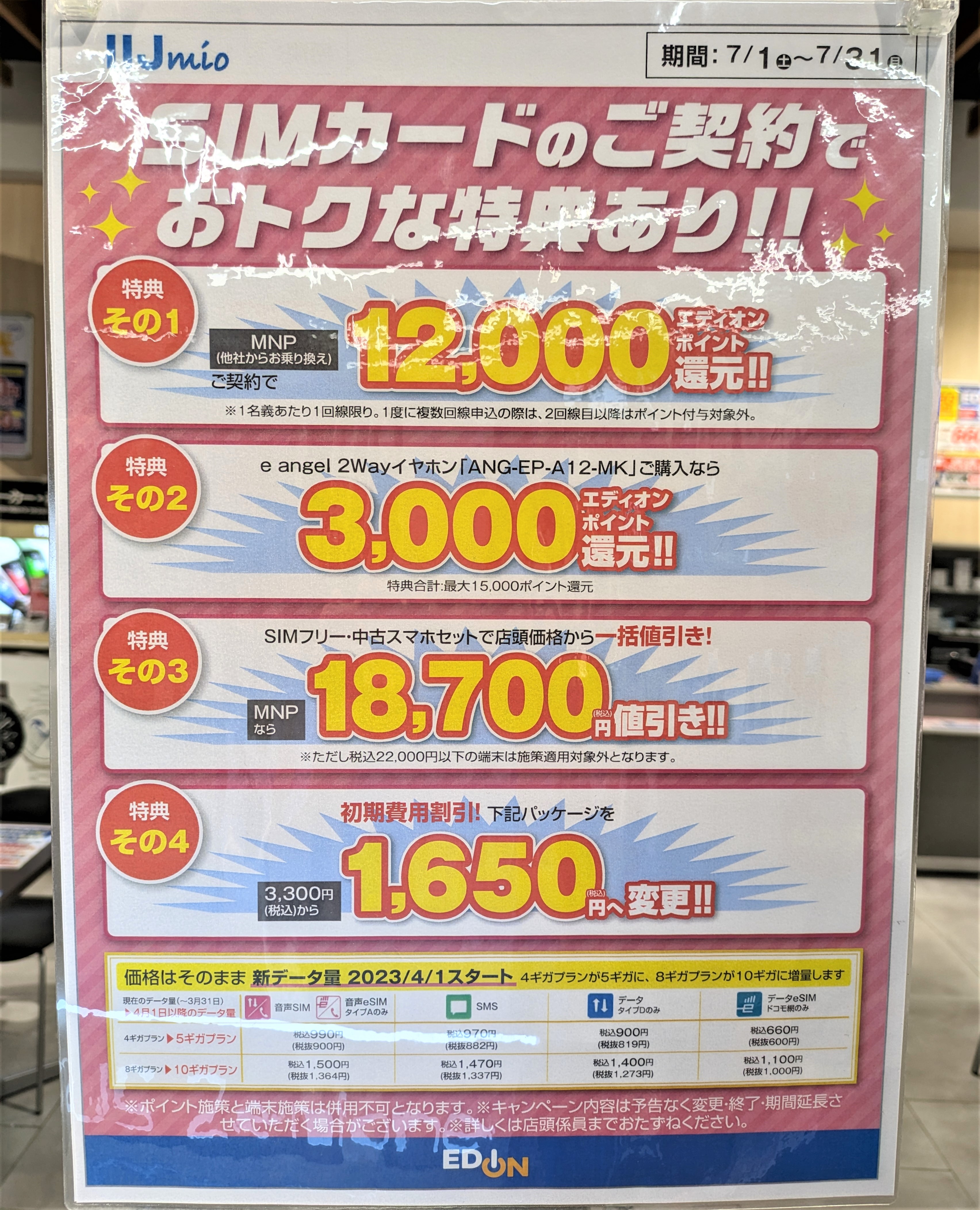 エディオンでは、IIJmioへのSIMのみMNPで12,000エディオンポイント還元となっています。事務手数料は1,650円(税込)。7/31(月)まで。