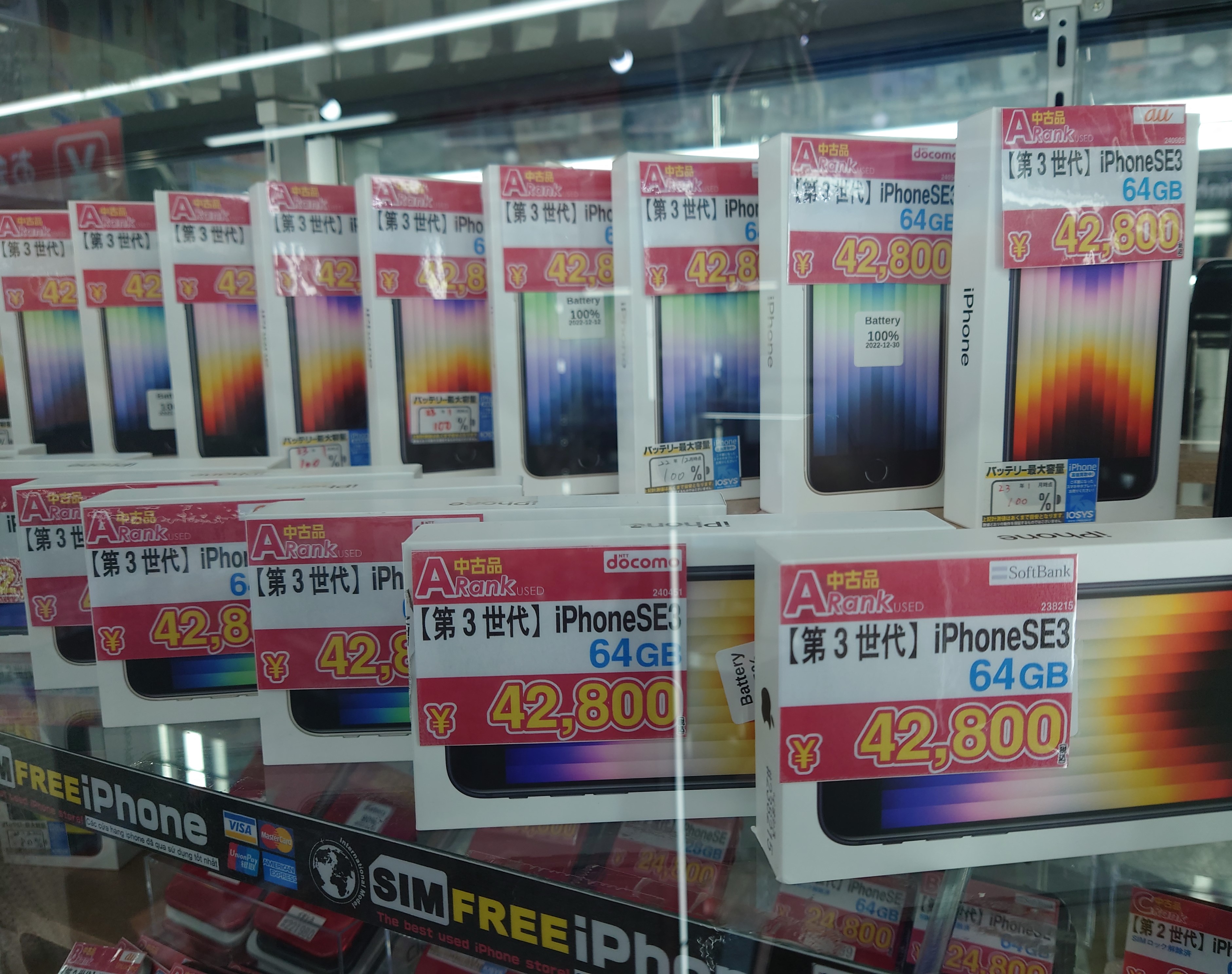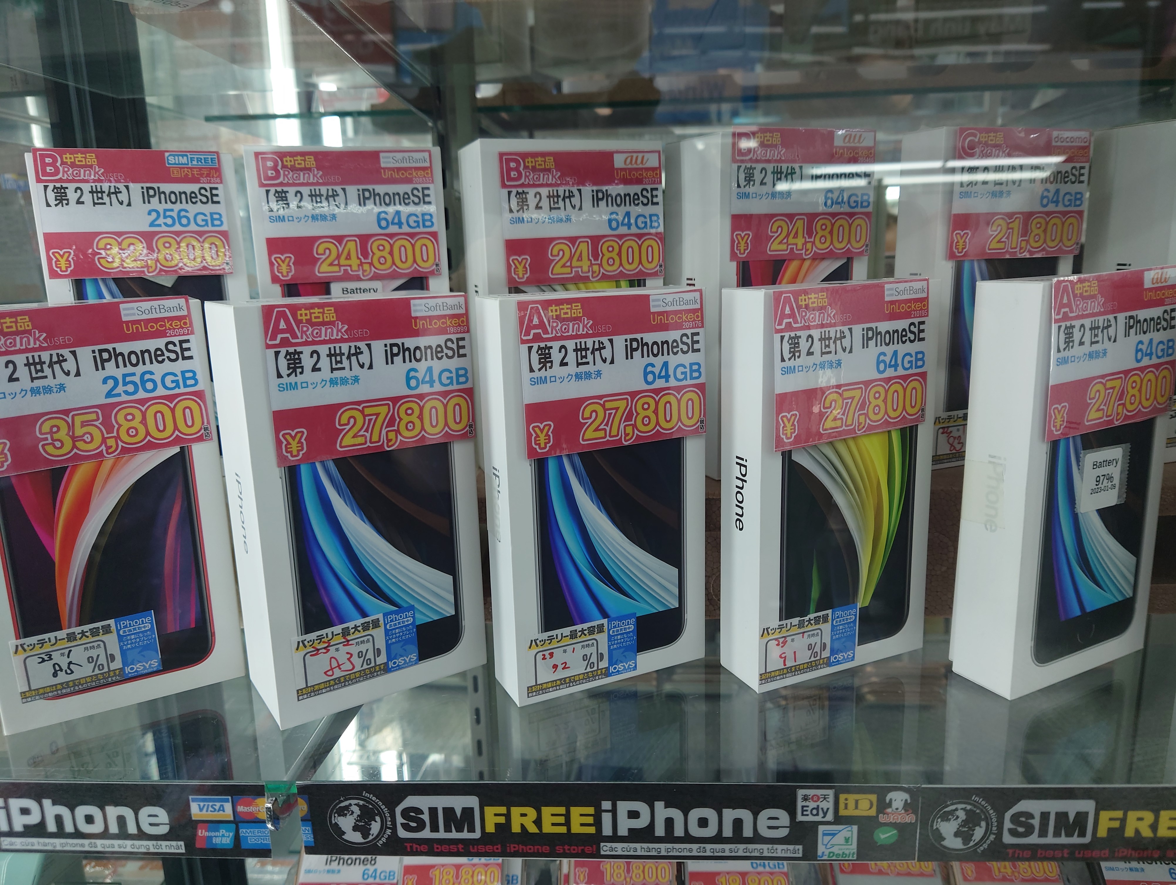 ちなみにイオシスの「iPhone SE2 64GB Aランク(ネットワーク利用制限▲)」は25,800円(税込)ですが、ネットをみていたら大阪日本橋4丁目で、ネットワーク利用制限無しで25,800円(税込)が1台だけありました。SIMロックがされているからということなんでしょうか。詳細は店舗でご確認下さい。※2/4時点