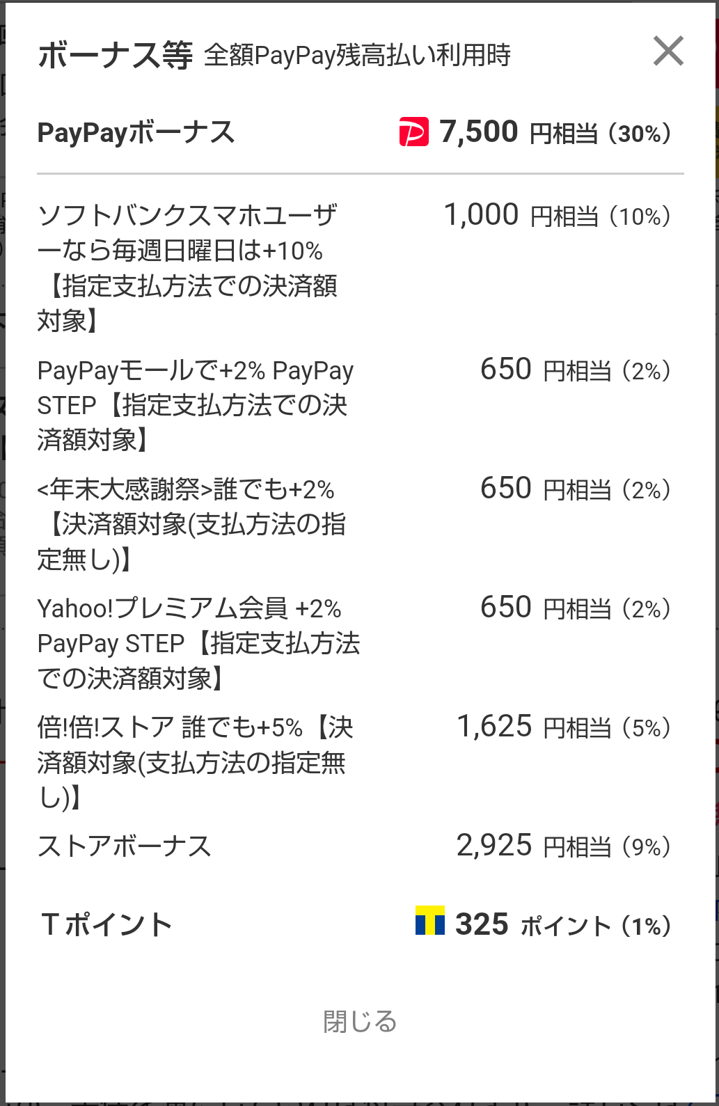 ボーナス等は、PayPayとyahooIDの紐づけやエントリーを行えば誰でも7,000円程度は獲得出来ます。ソフトバンクユーザー10%(上限1,000円)についても、日曜日に限っては誰でも5%で代用して1,000円獲得可能です。