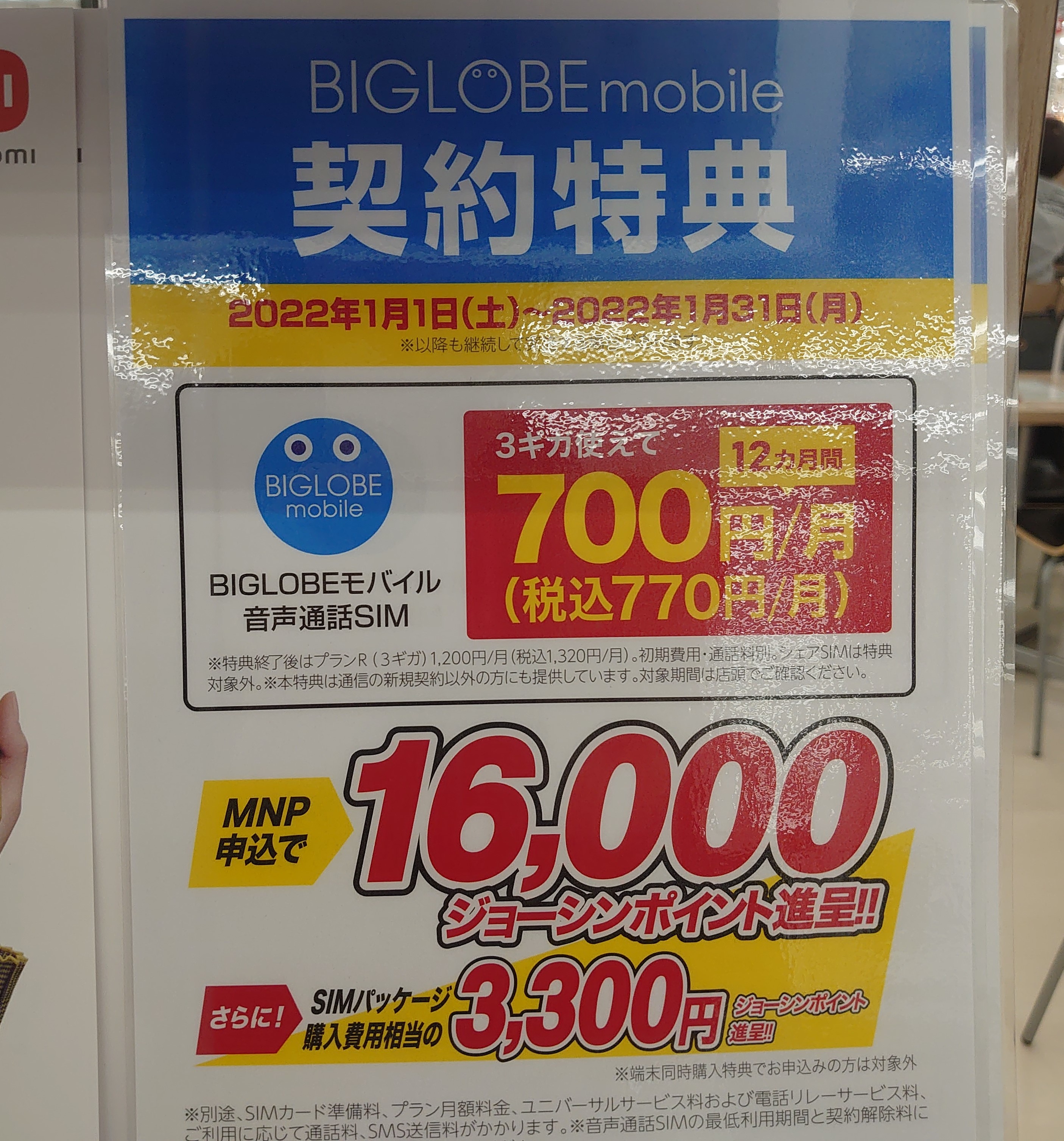 もともとジョーシンにはほとんど行かないので、だいぶ前から実施されていた可能性もありますが、ジョーシンではビッグローブへのSIMのみMNPで16,000ジョーシンポイント還元となっています。