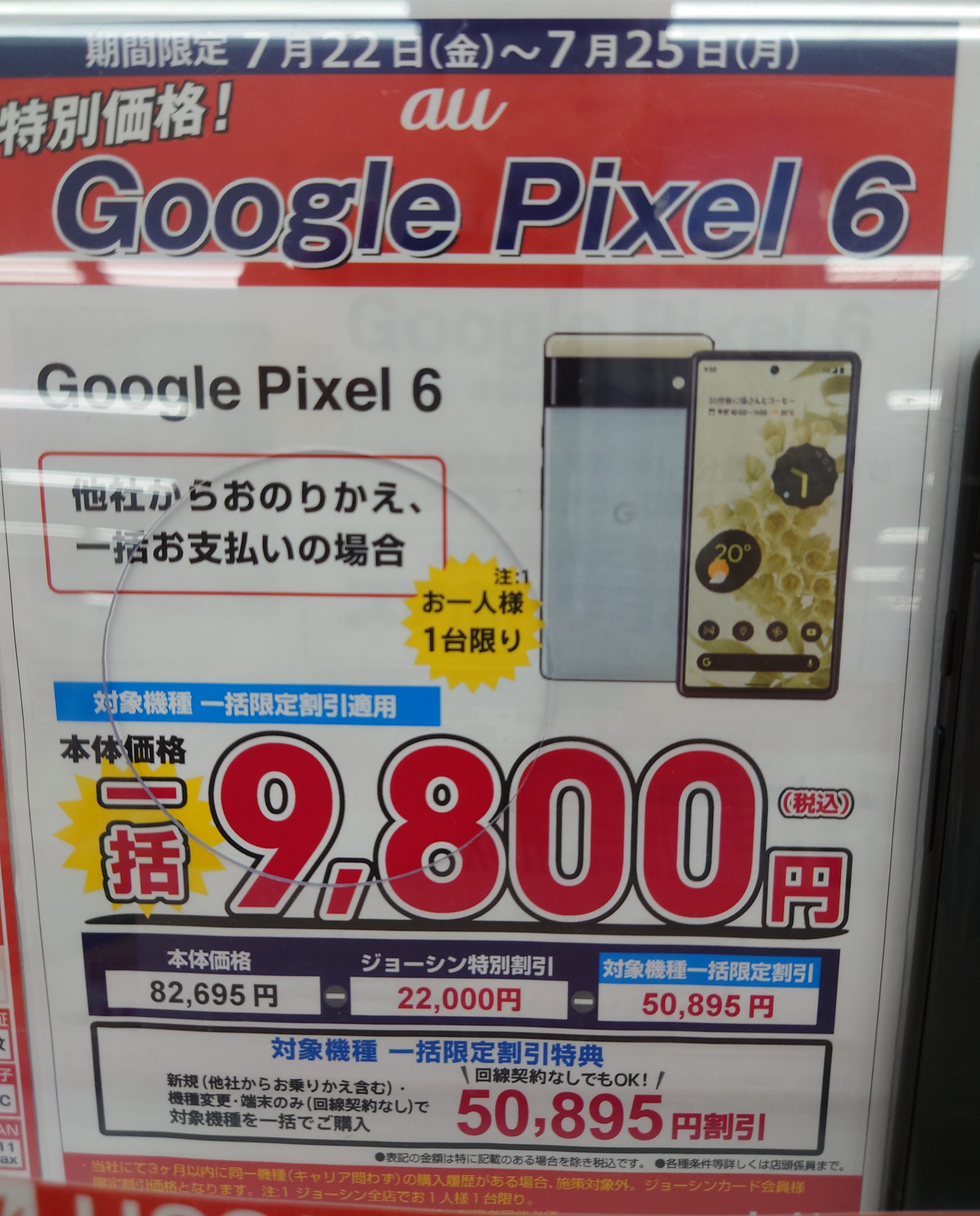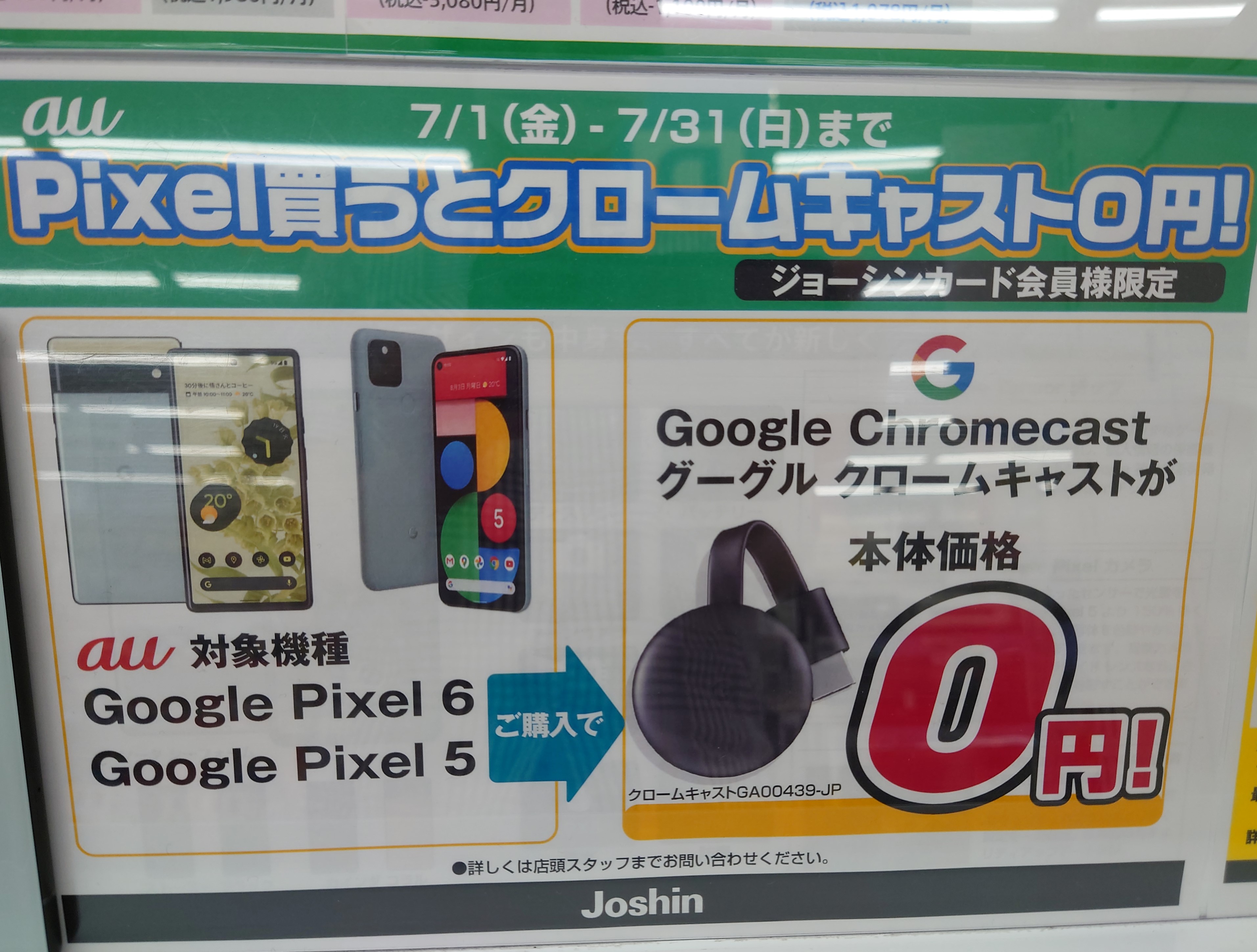 ジョーシンではau「Google Pixel 6(税込82,695円)」購入で、「Google Chromecast(グーグルクロームキャスト)」が0円となっています。7/31(日)まで。MNPで一括9,800円(税込)、こちらは7/25(月)まで。若干の手遅れ感は否めませんが、一応ご報告致します。
