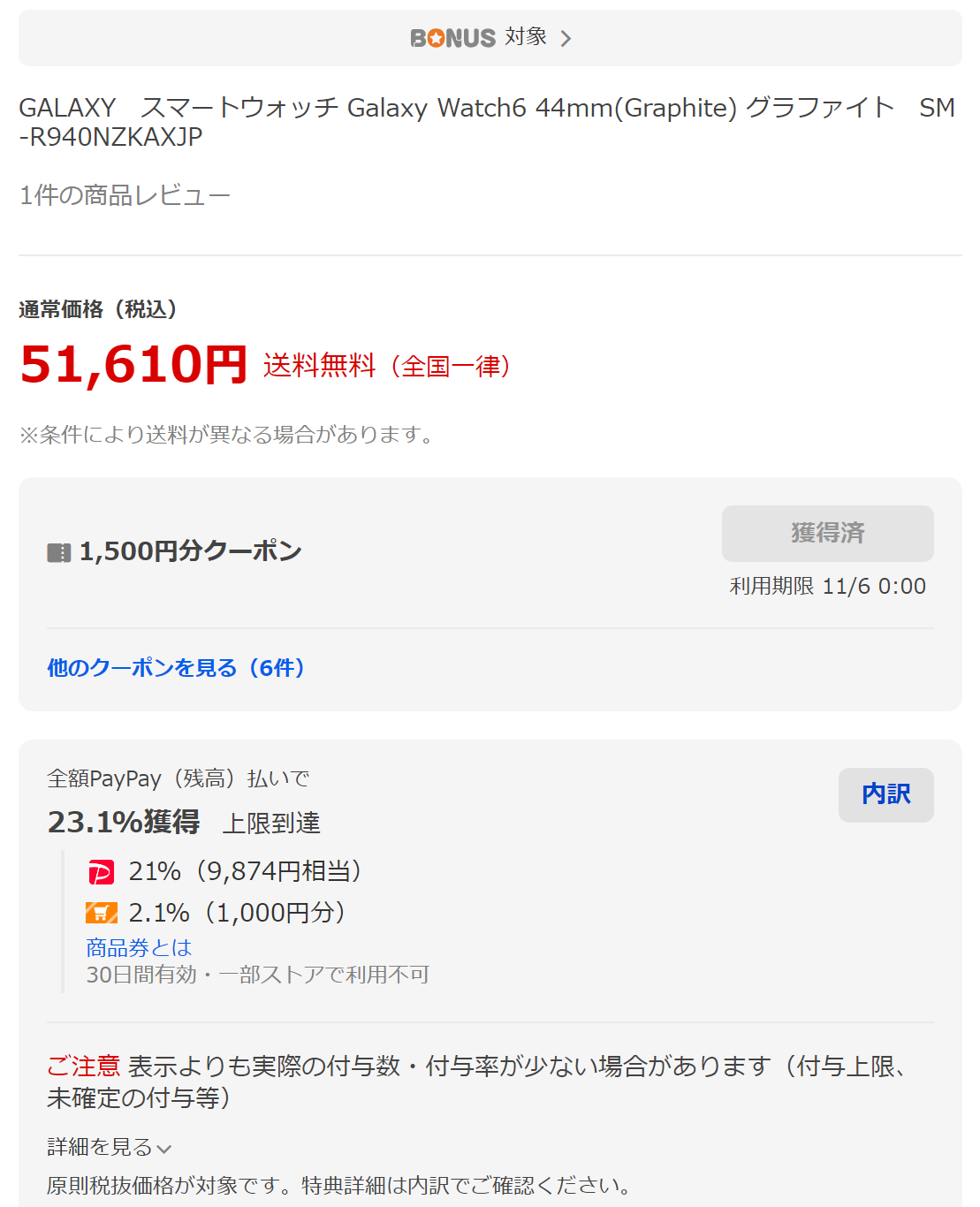 2023年11月5日(日)、コジマYahoo!店では、2023年9月発売の「Galaxy Watch6 44mm」が「1,500円OFFクーポン適用」に、1万円を超えるPayPay還元等により実質約4万円程度になっています。
