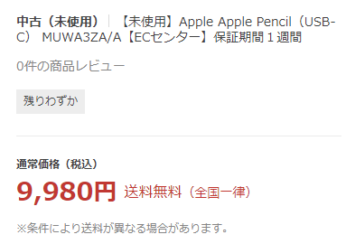 2024年1月5日(金)、じゃんぱらYahoo!店(ECセンター)では、未使用品の「Apple Pencil(USB-C)」が9,980円(税込)となっています。