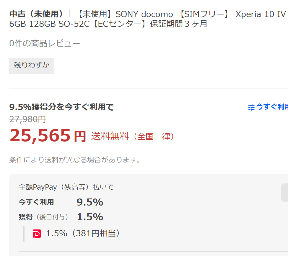 2024年4月21日(日)、じゃんぱらYahoo!店では、未使用品のドコモ「Xperia 10 IV」がPayPayポイント獲得分を今すぐ利用で、約25,565円(税込)となっています。