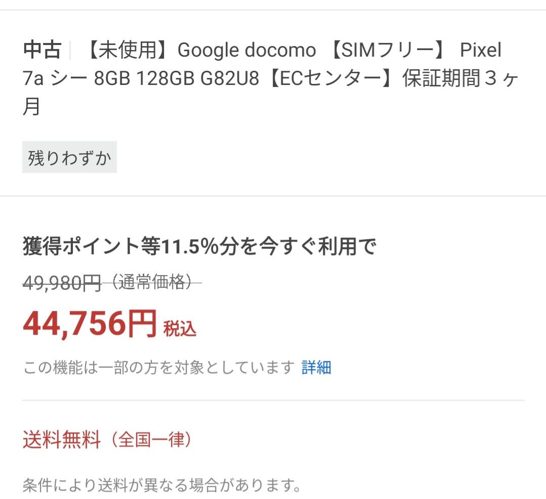 2023年12月29日(金)、じゃんぱらYahoo!店(ECセンター)では、未使用品のドコモ「Google Pixel 7a」が獲得ポイント等を今すぐ利用で、約44,756円(税込)となっています。