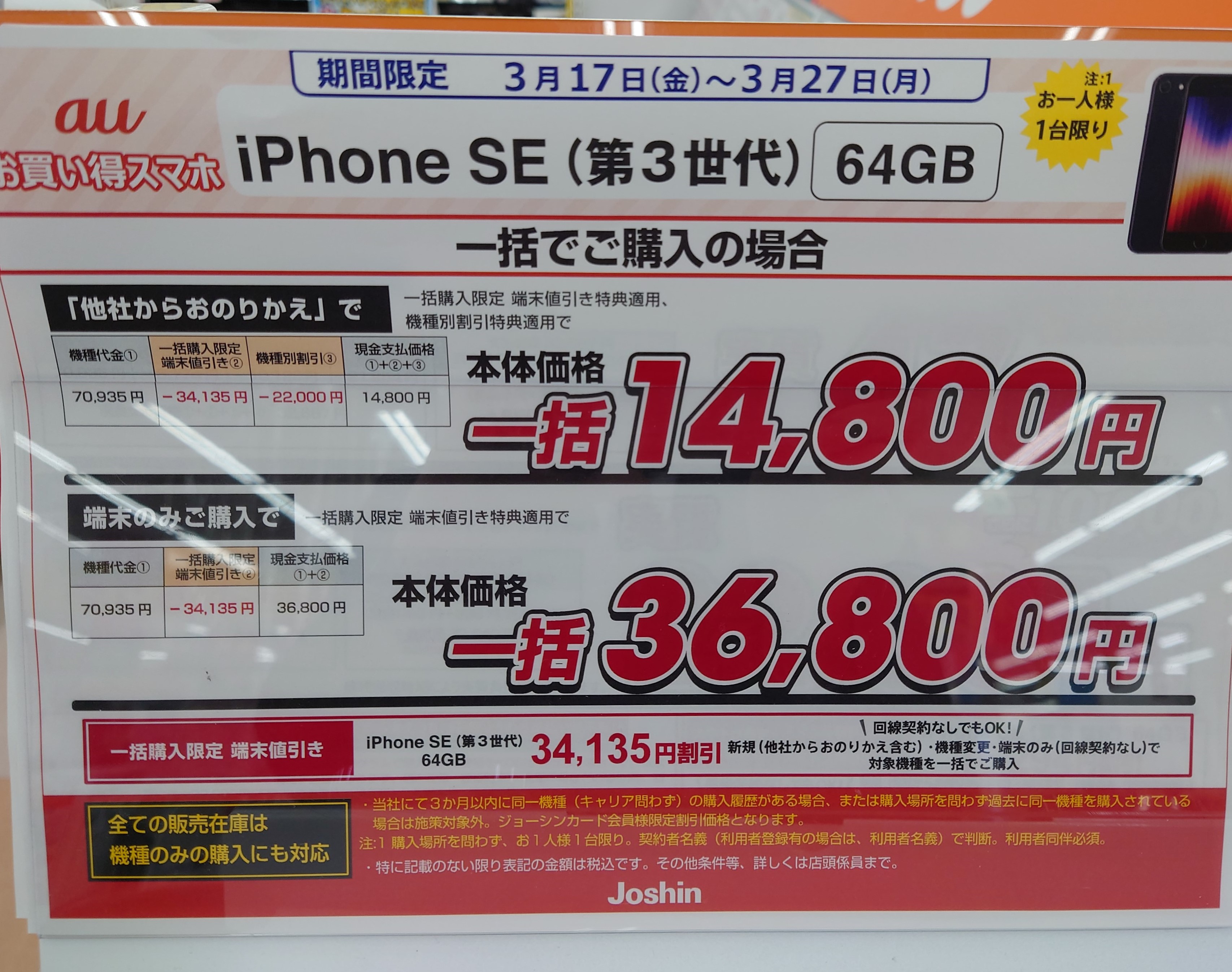 ジョーシンではau「iPhone SE 64GB(税込70,935円)」がMNP一括14,800円(税込)となっています。事務手数料は3,300円(税込)。3/27(月)まで。