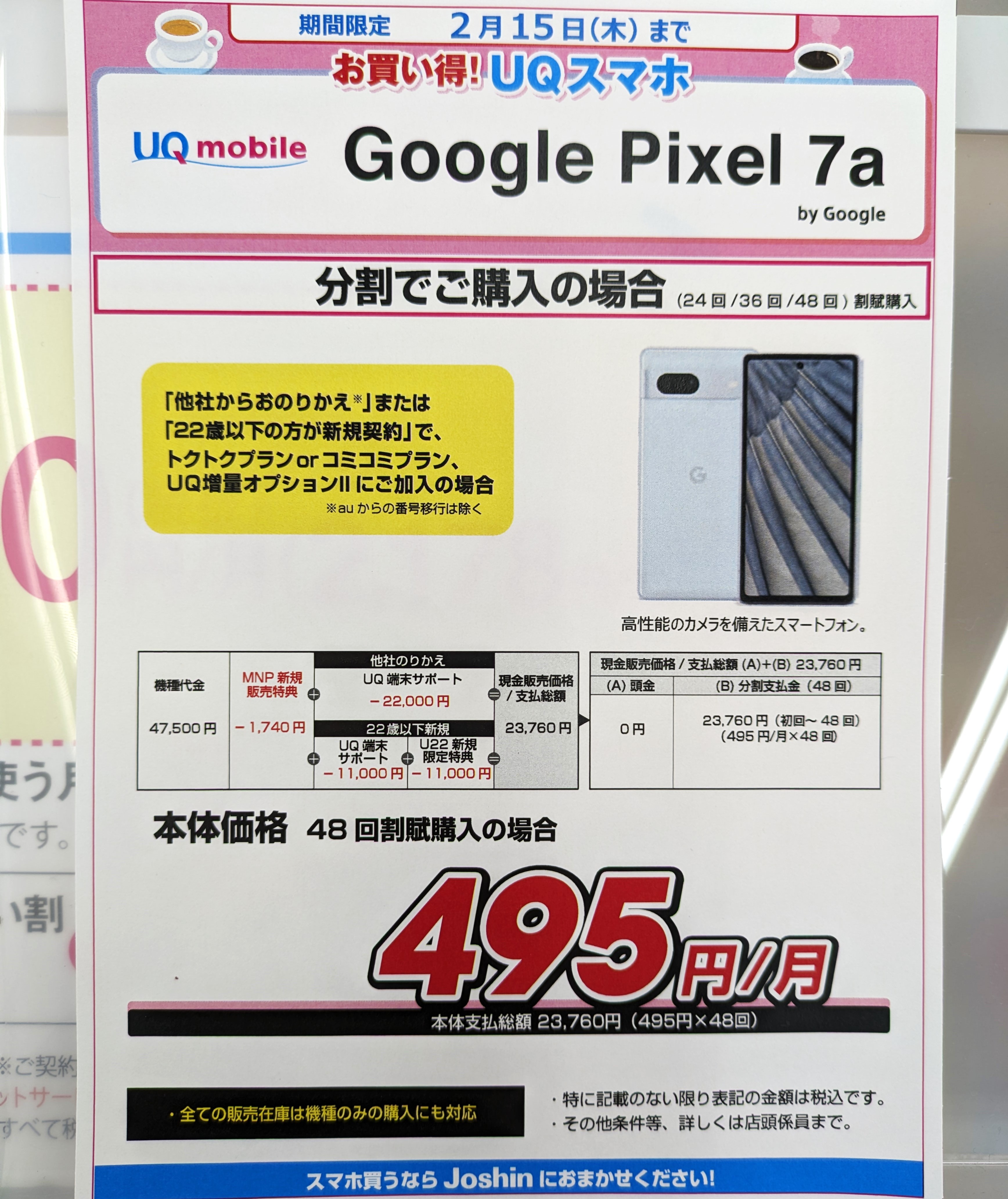 ジョーシンでは、UQモバイル「Google Pixel 7a(税込47,500円)」がMNP若しくは22歳以下新規で、分割総額23,760円(税込)となっています。
